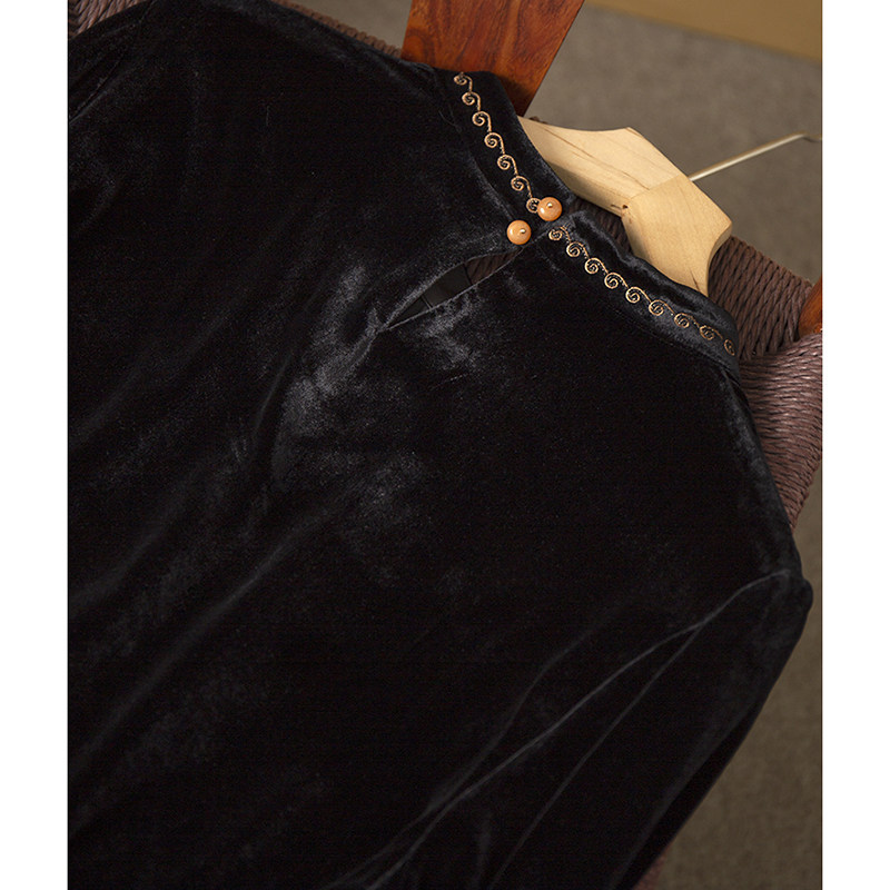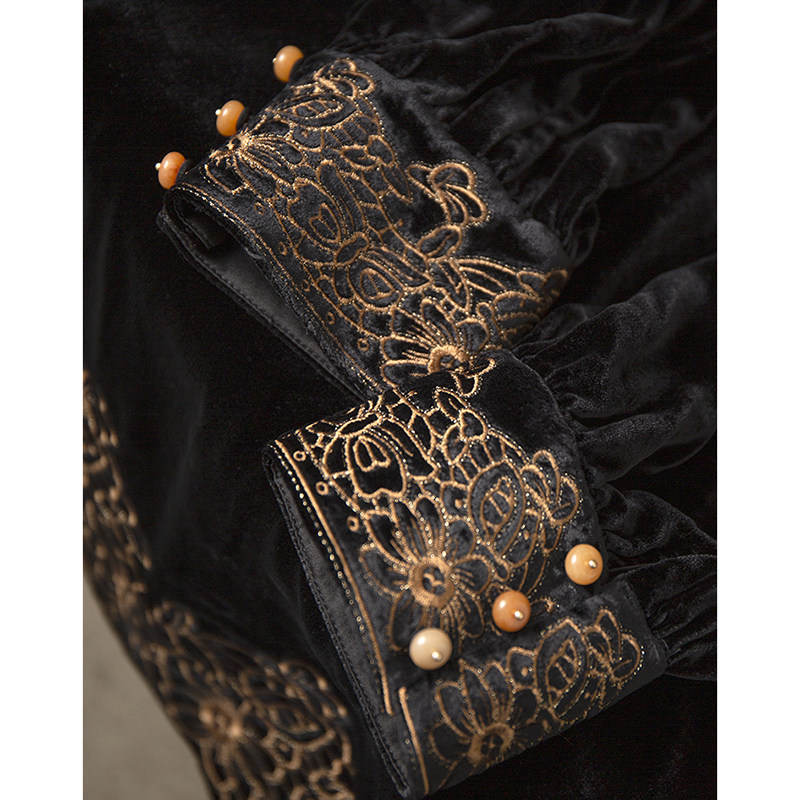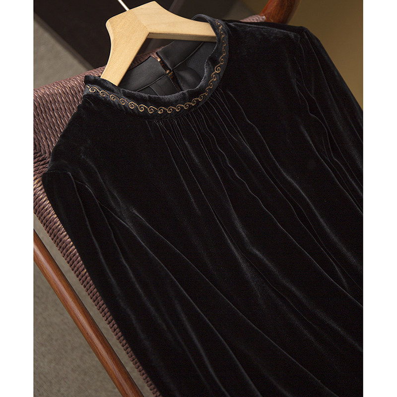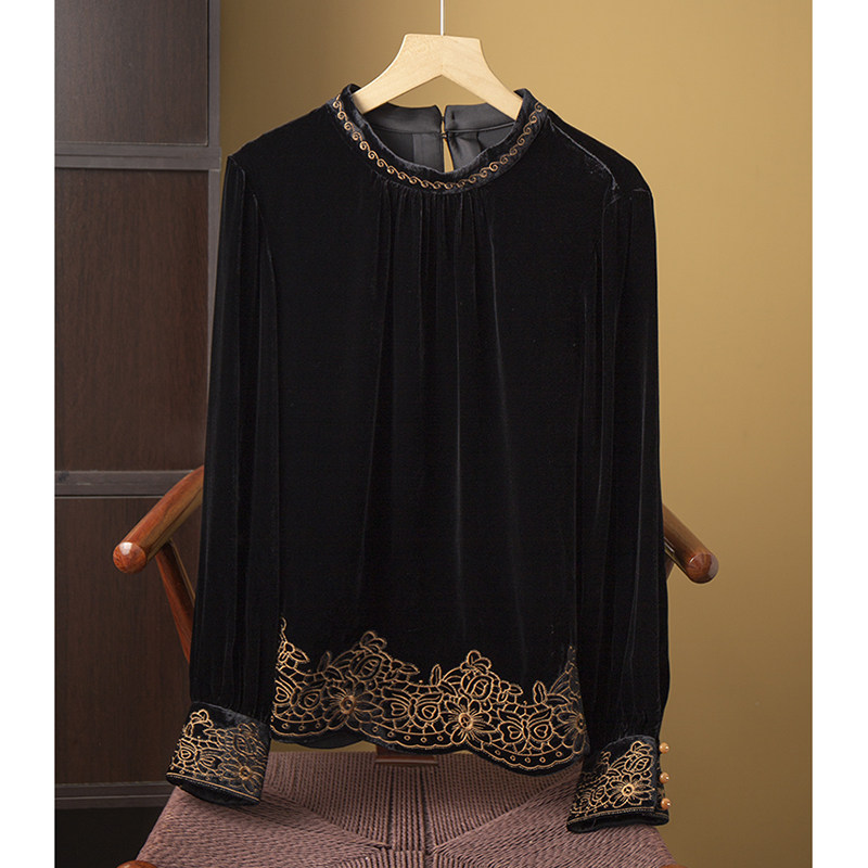 丝艺原创100%桑蚕丝底布下摆精致刺绣丝绒立领灯笼袖长袖真丝衬衫