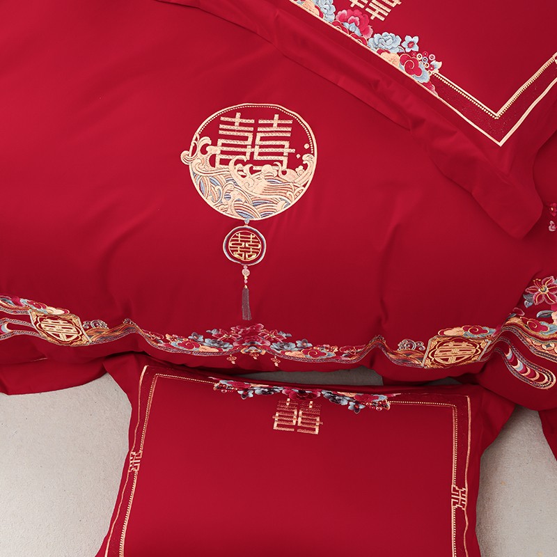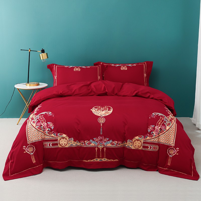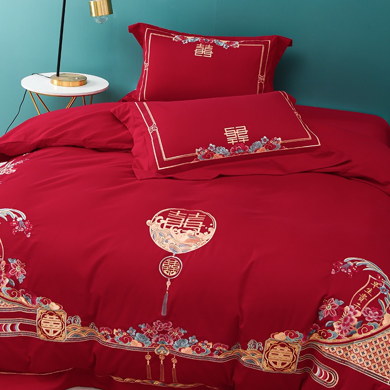 冬季结婚 100支全棉磨毛婚庆四件套绣花中式暖大红色床上用品