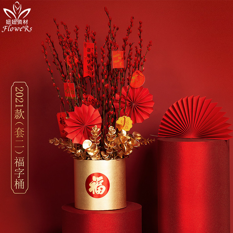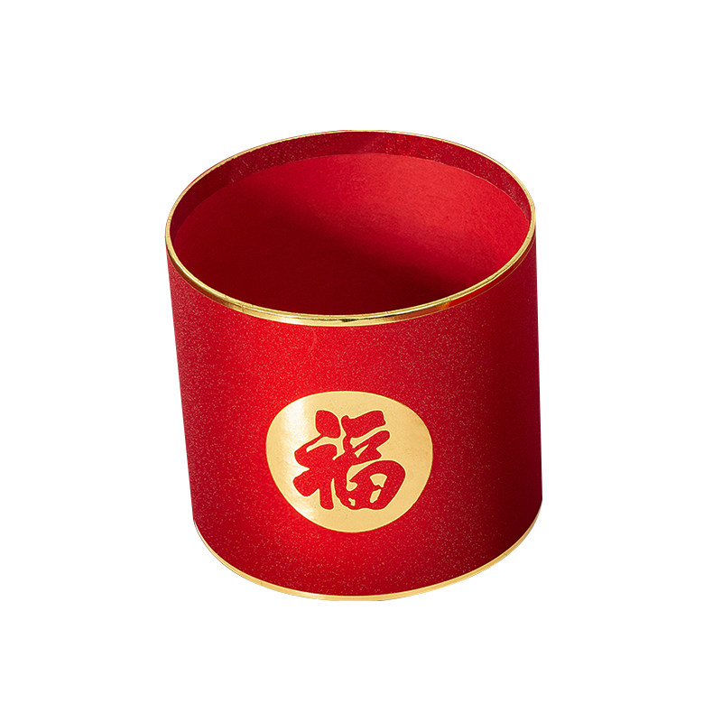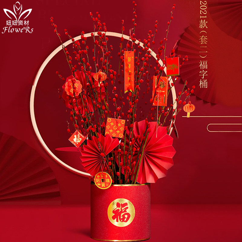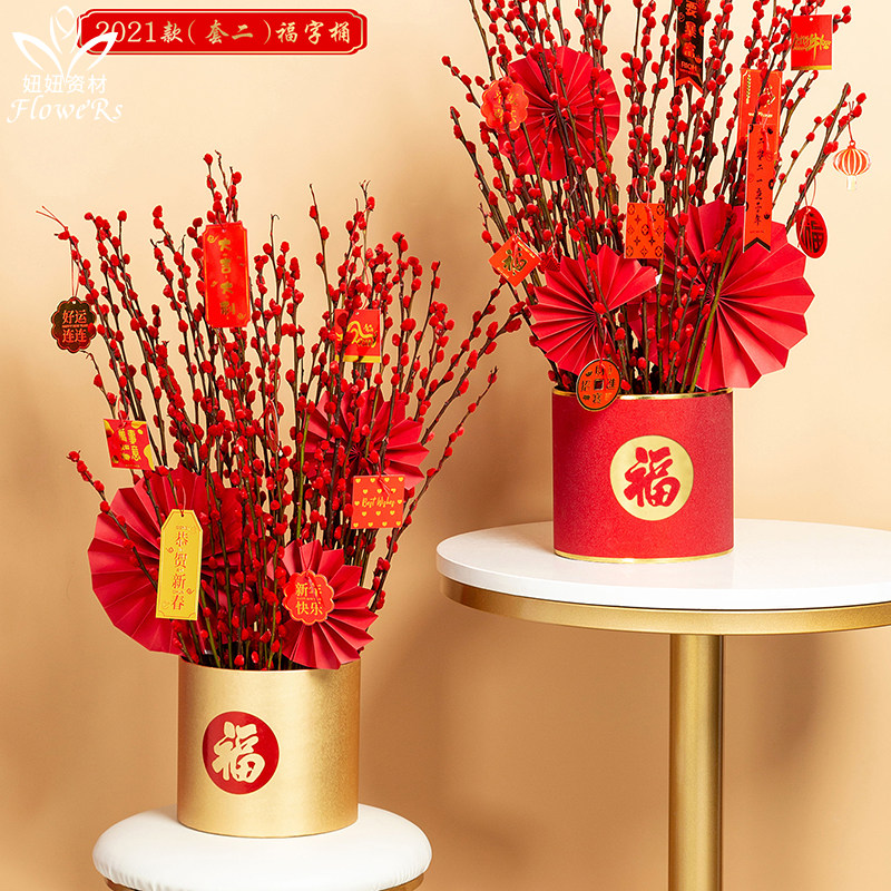 圆形套二福字抱抱桶鲜花包装盒银柳冬青插花盒过年装饰礼盒福桶