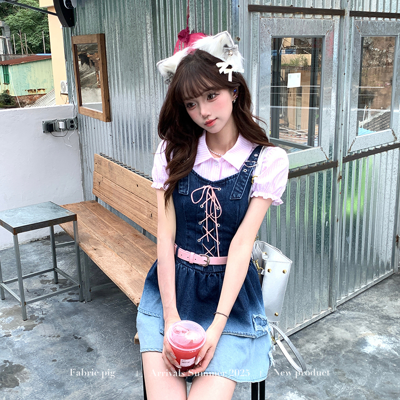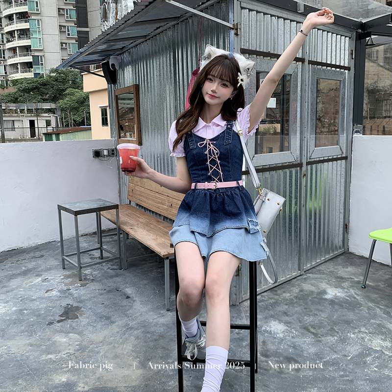 织物猪 银河甜梦 渐变蓝色牛仔背带裙女夏甜美短裙蓬蓬裙两件套装