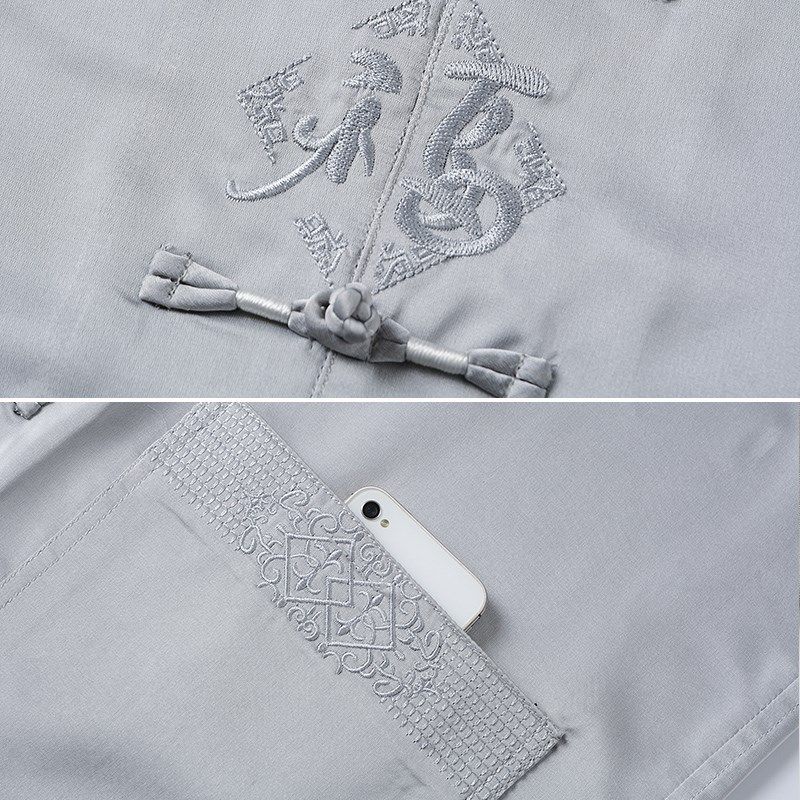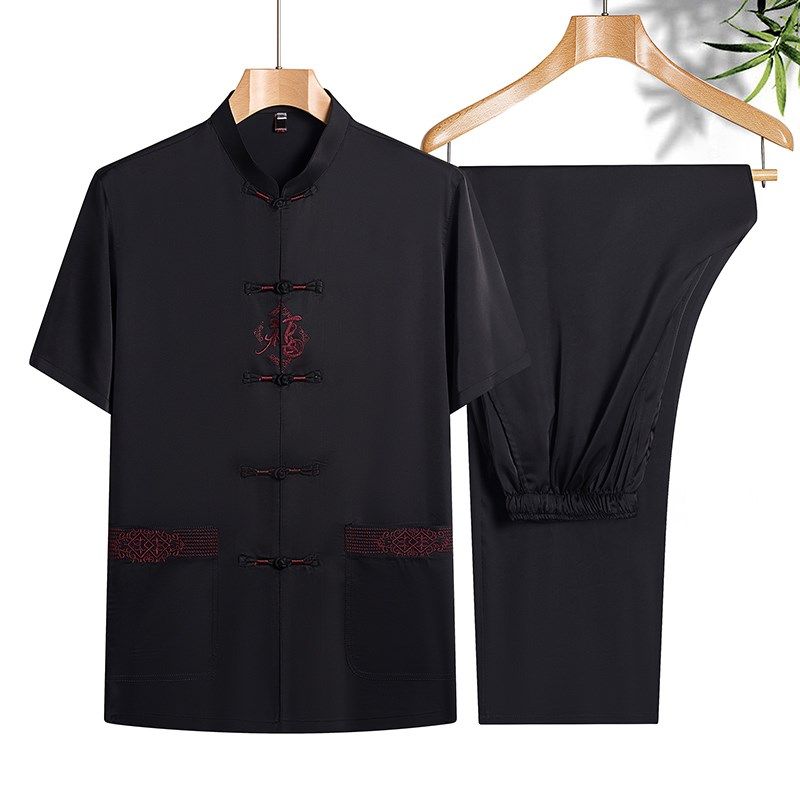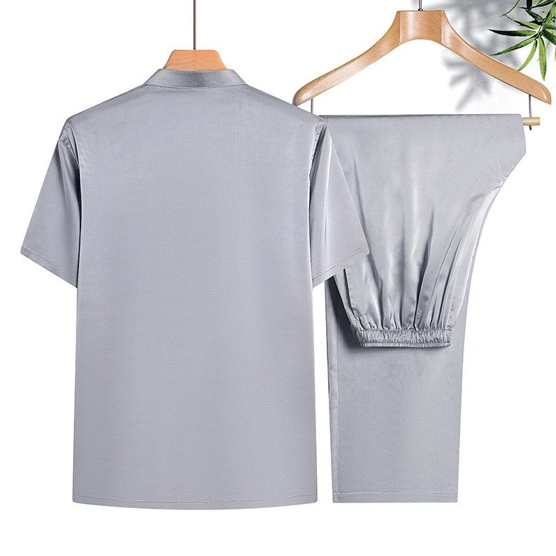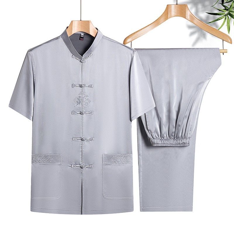 老年人唐装夏款短袖套装男中老年装爷爷生日婚宴装中国风中式衬衫