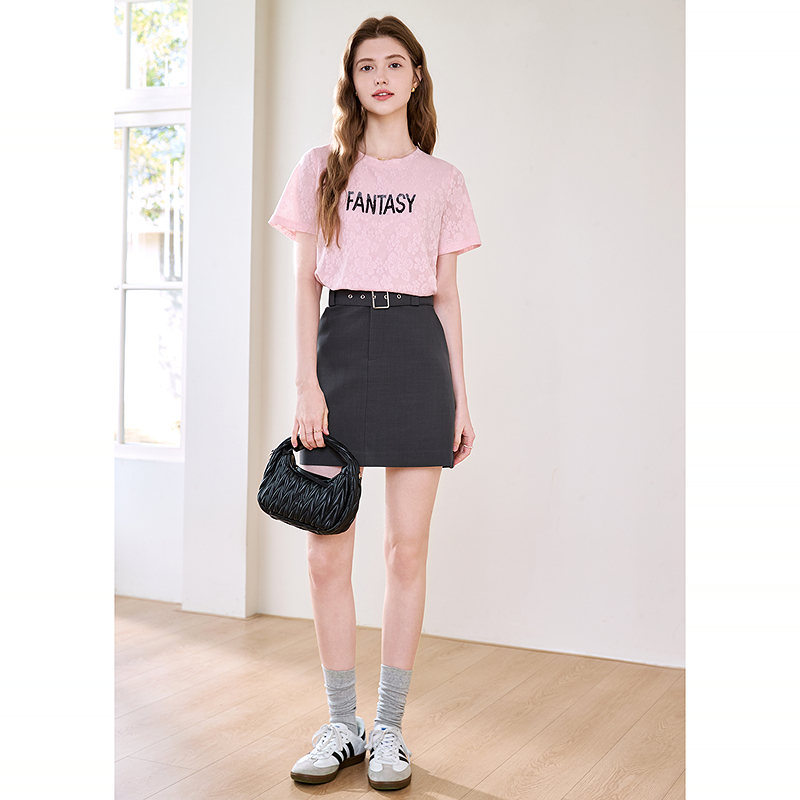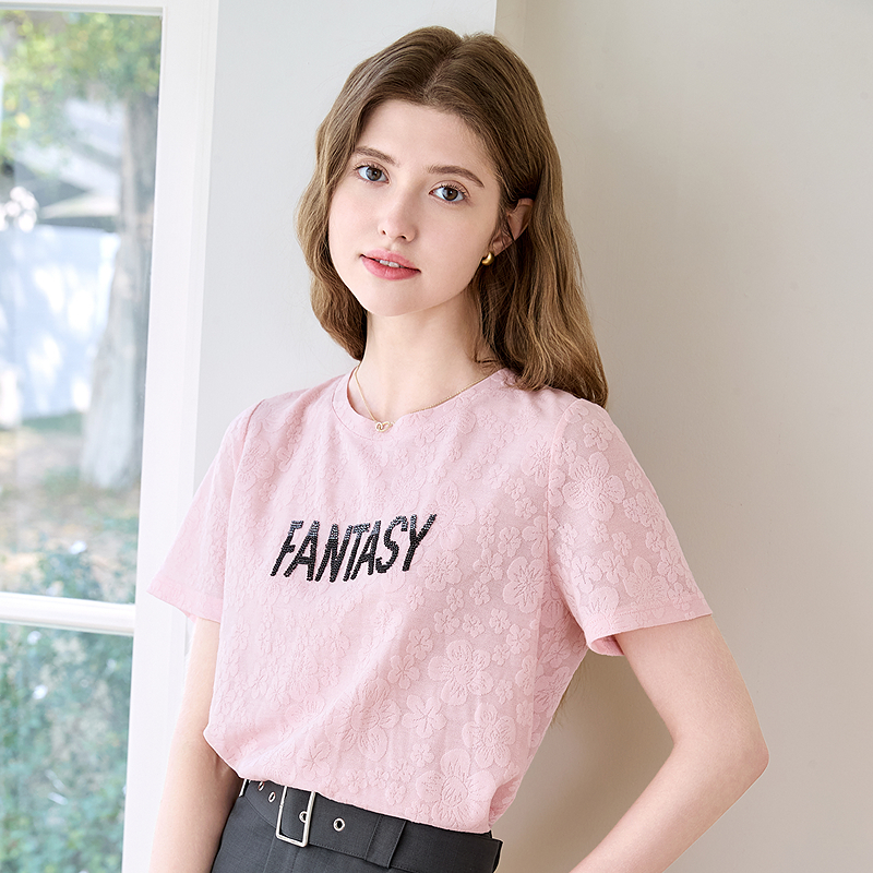 2025百图提花针织T恤圆领字母图案短袖上衣女两色可选