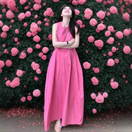 法式多巴胺玫粉色无袖背心连衣裙女夏季大码胖mm宽松收腰显瘦长裙