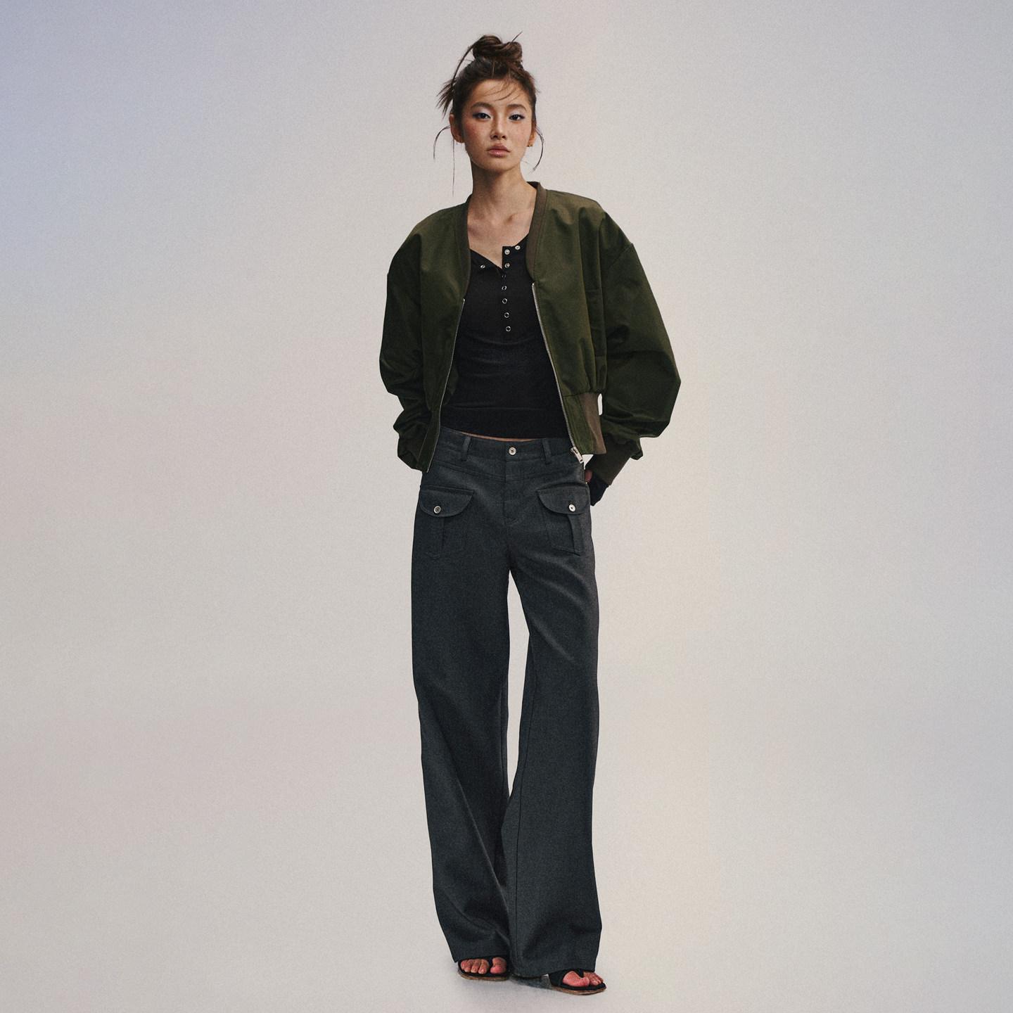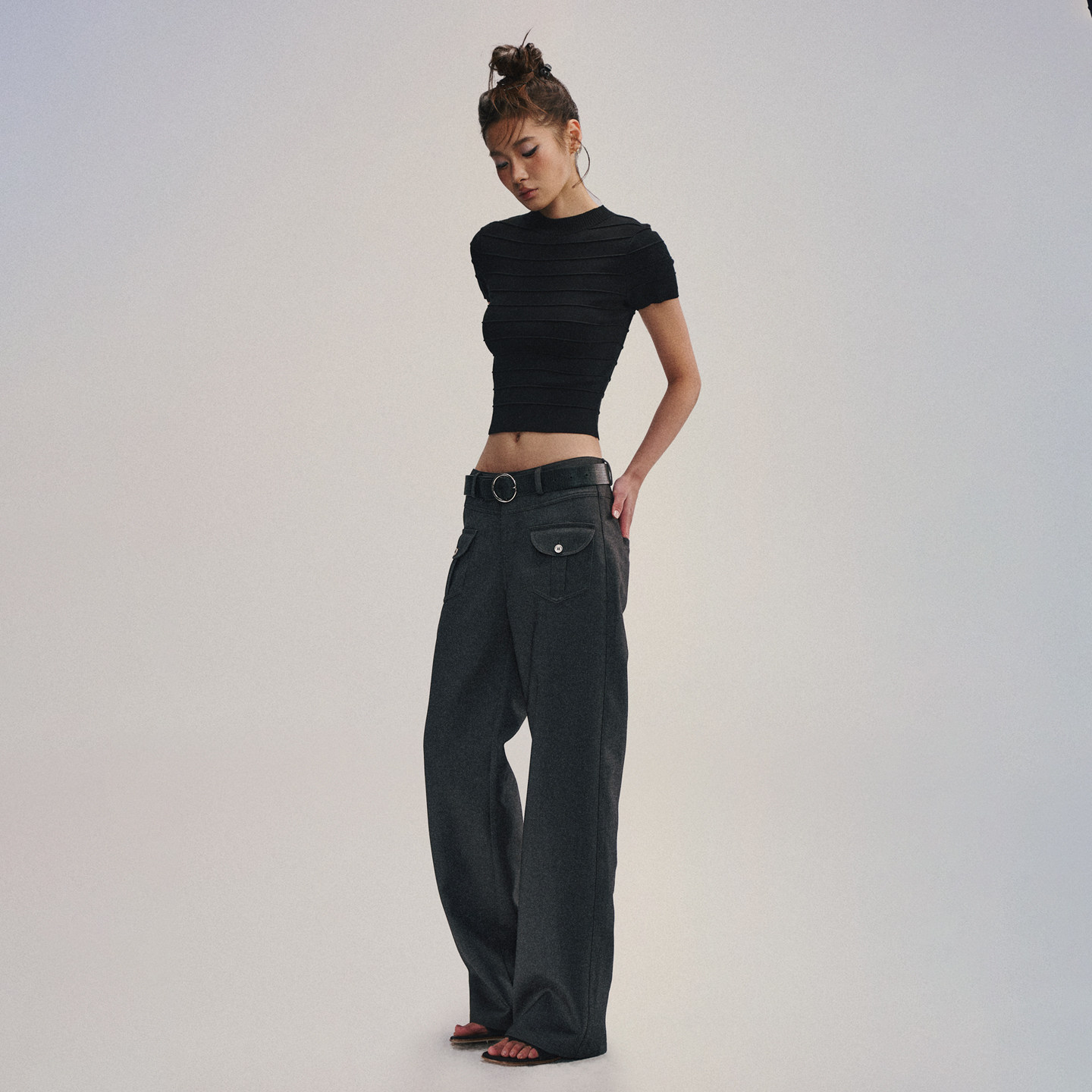 天丝羊毛混纺中低腰工字褶西装裤