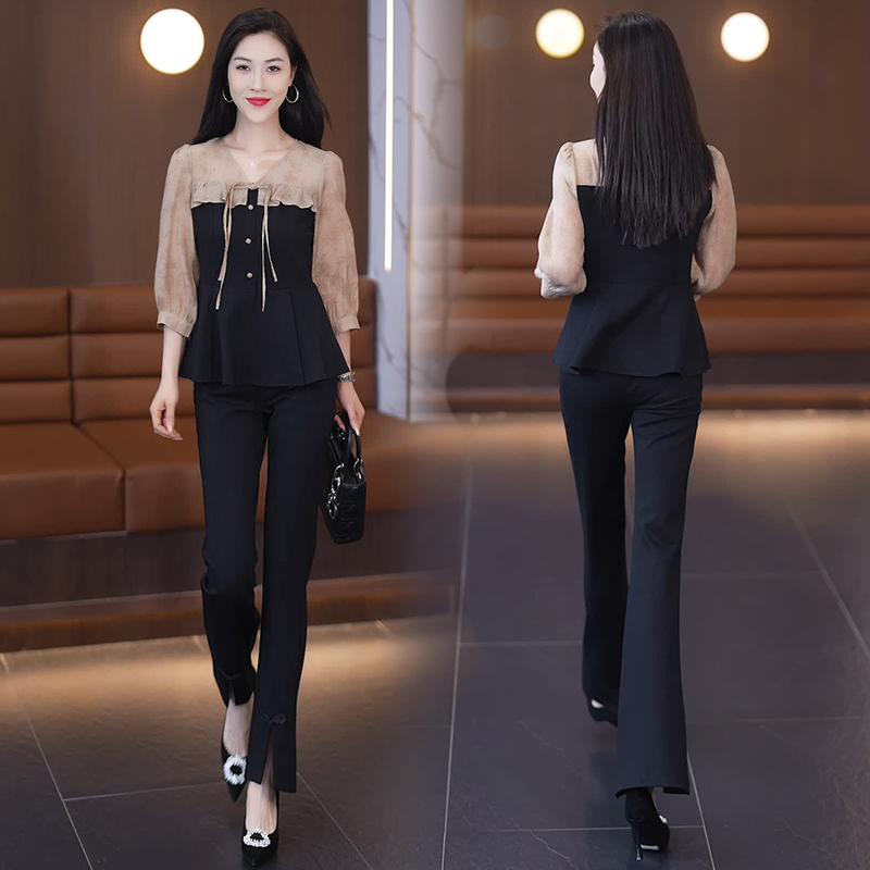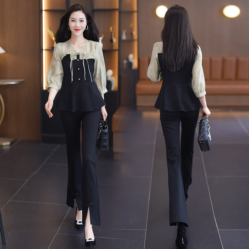 新中式时尚气质套装女早秋新款遮肚子显瘦七分袖衬衫微喇裤两件套
