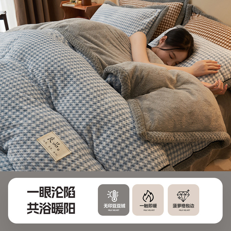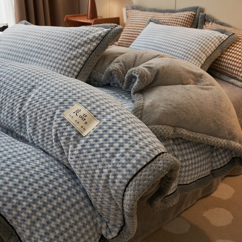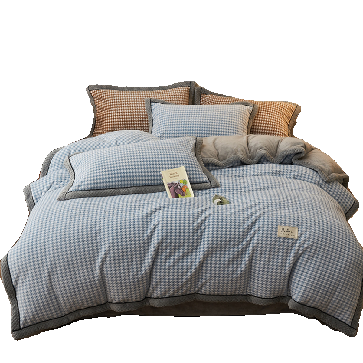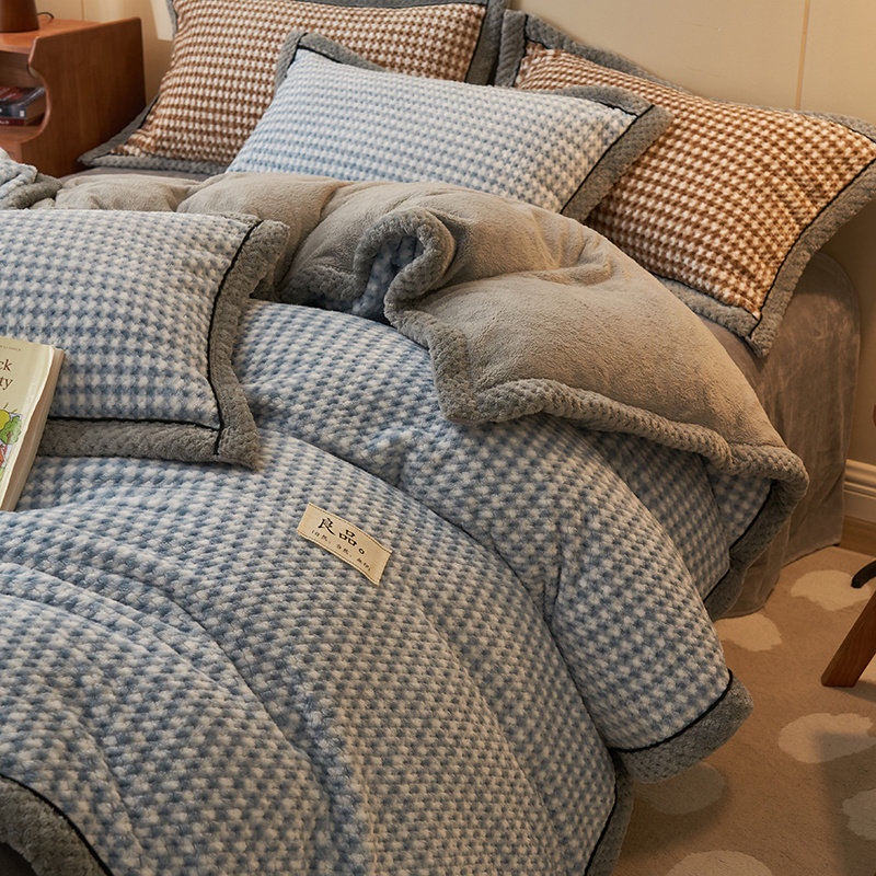 日式格子牛奶绒双面床上四件套加厚冬季珊瑚绒床品法兰绒被套床单