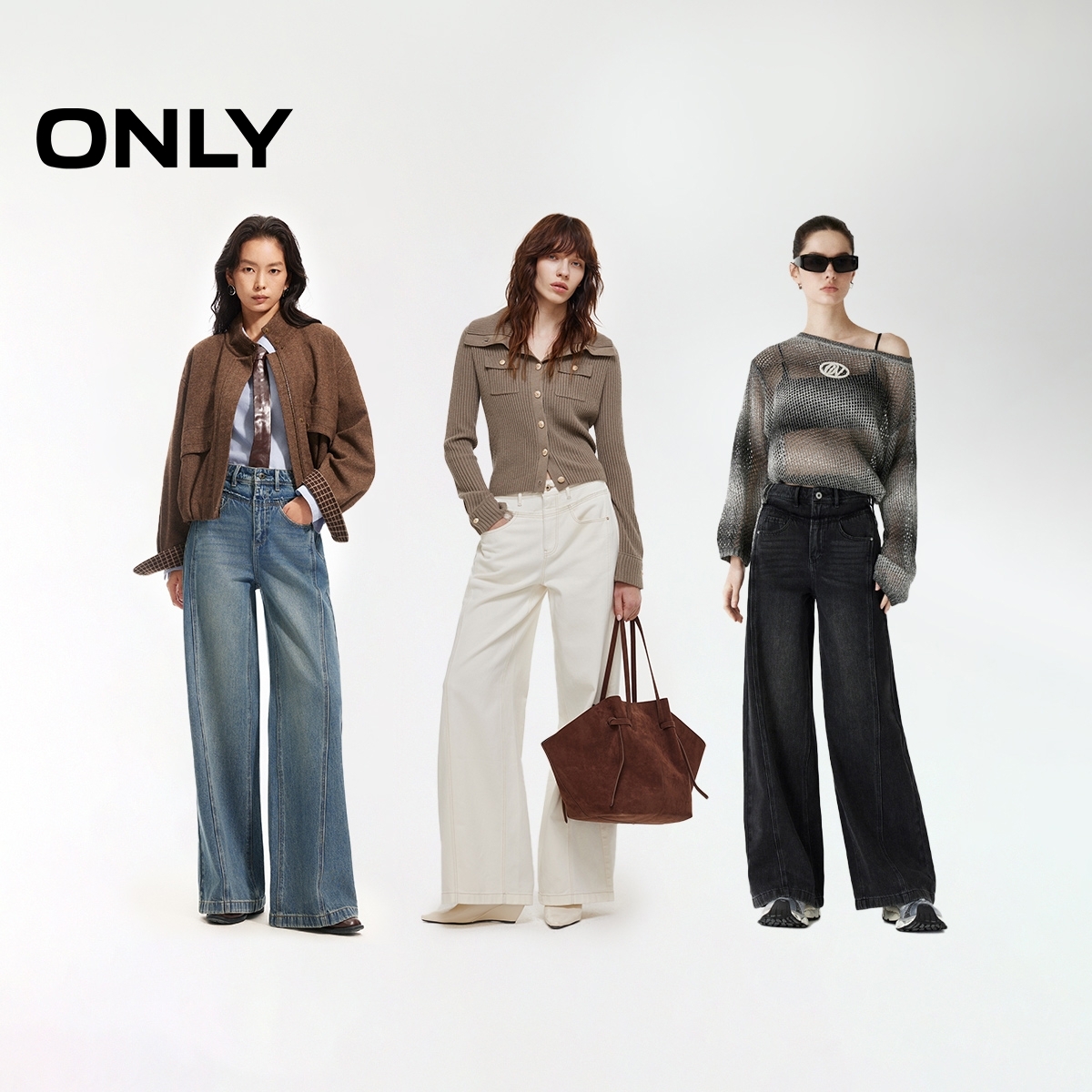 ONLY2026春季新款复古水洗个性毛边侧分割线高腰阔腿显瘦牛仔裤女