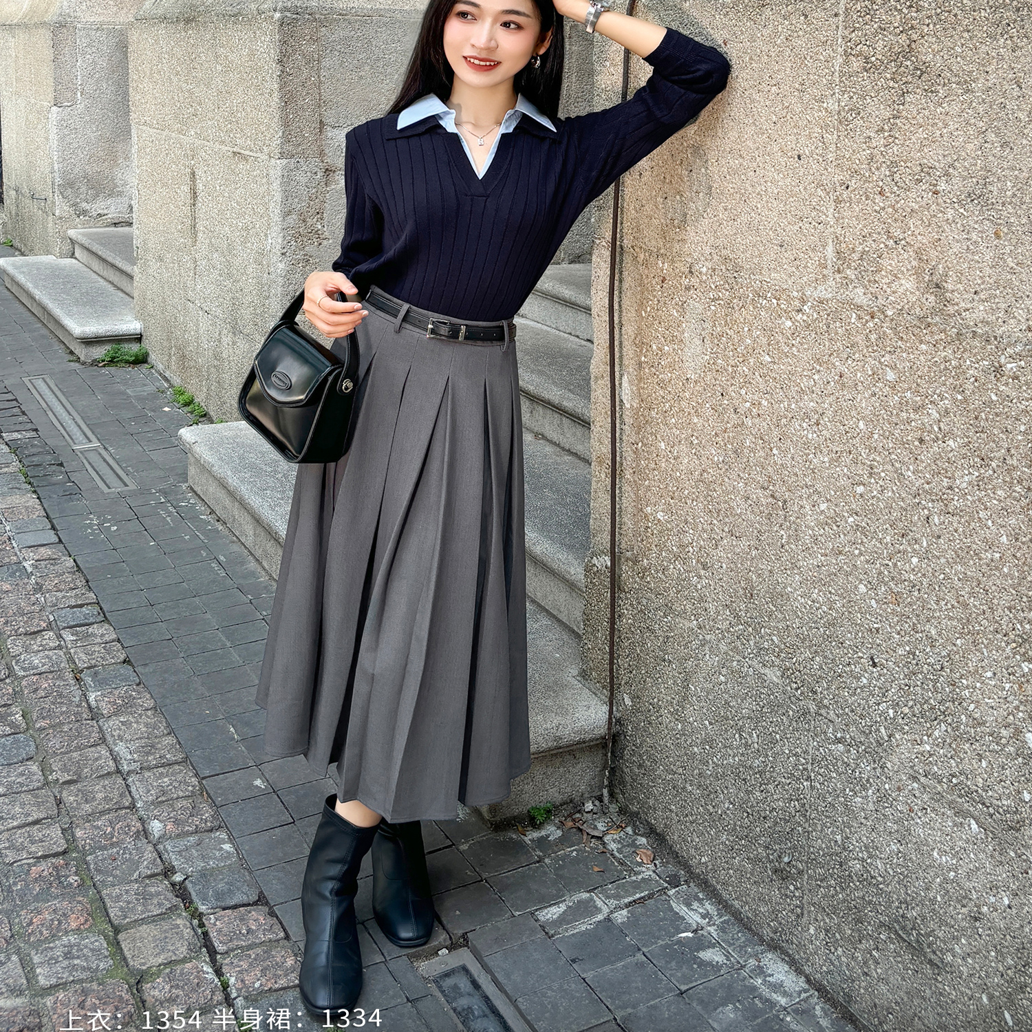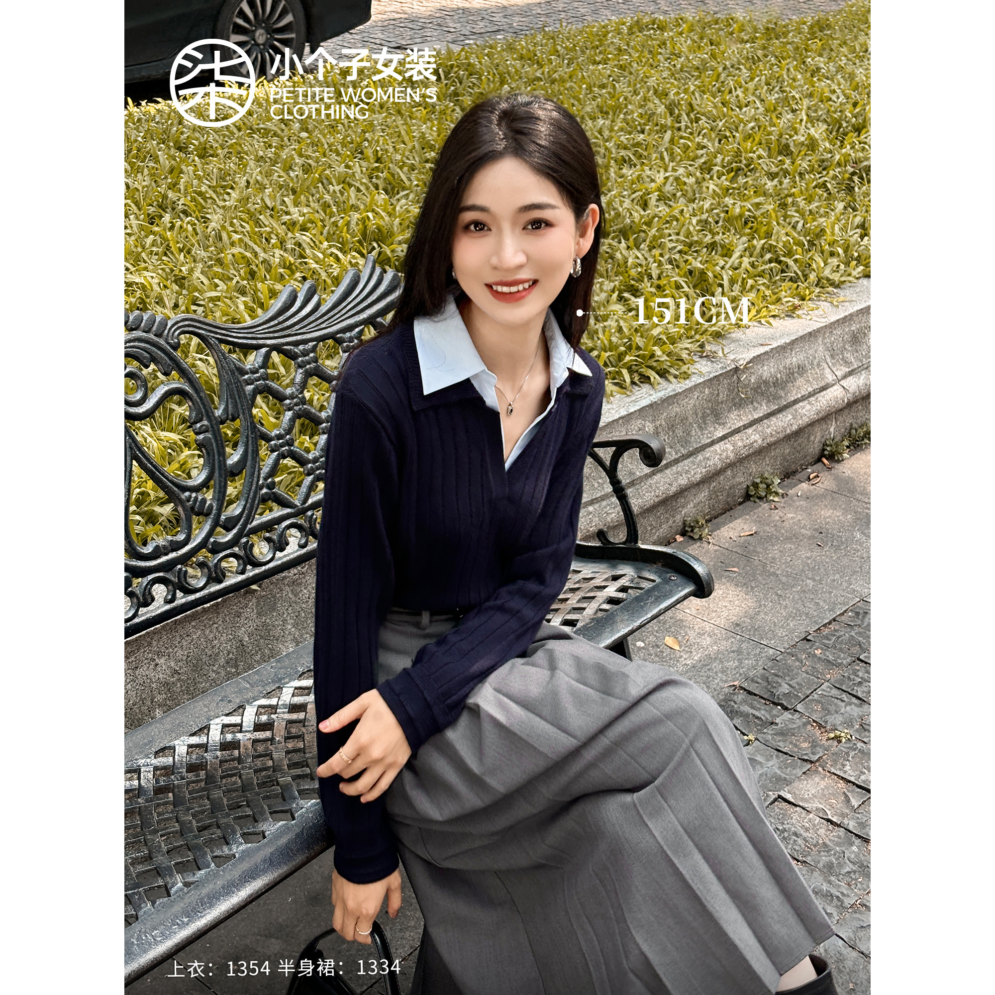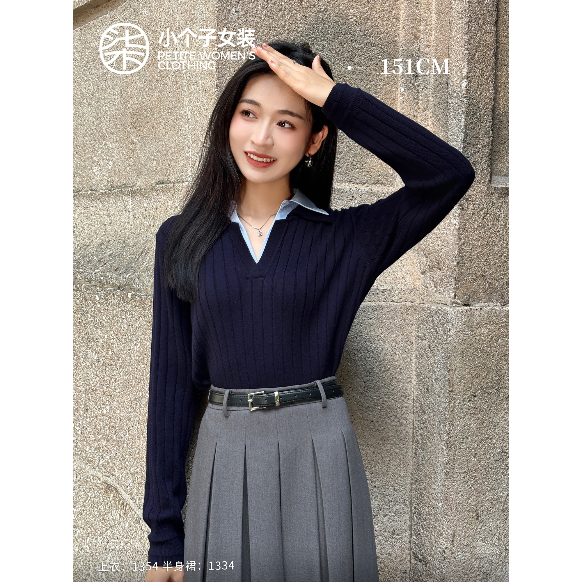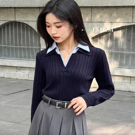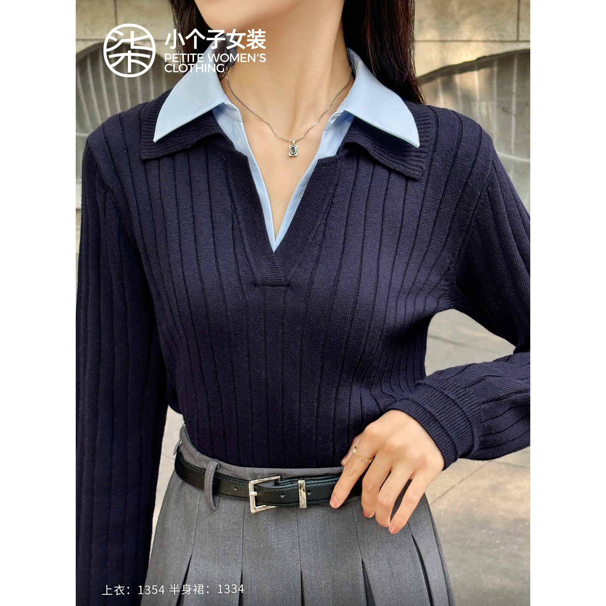 柒量一裁小个子深蓝色针织上衣毛衣衬衫女款假两件通勤百搭1354