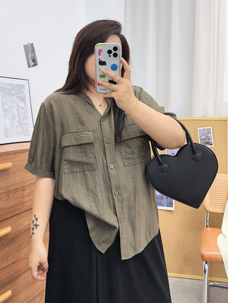 大码白色正肩短袖衬衫女夏季新款胖mm宽松薄款防晒衬衣法式上衣