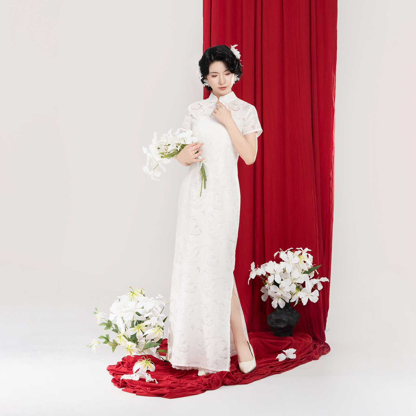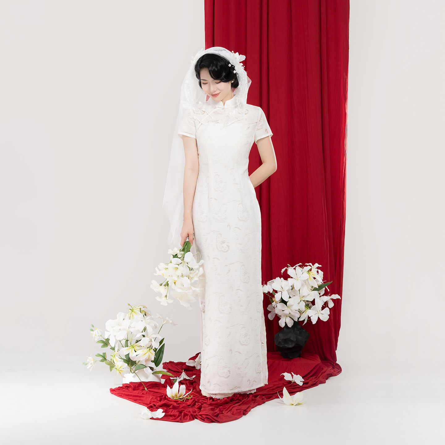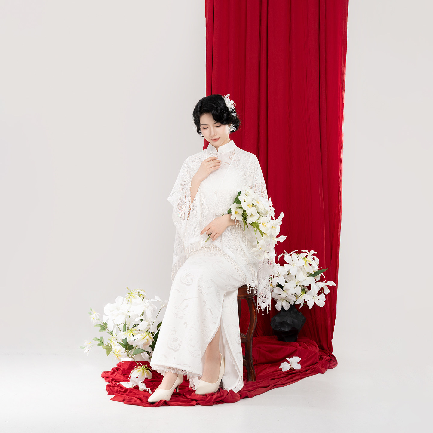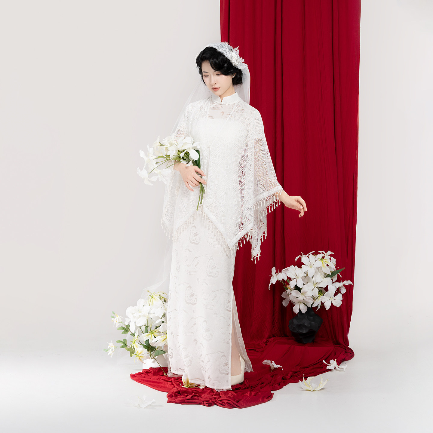 织造司[长相意]中式立领盘扣旗袍纯棉内搭吊带连衣裙镂空蕾丝披肩