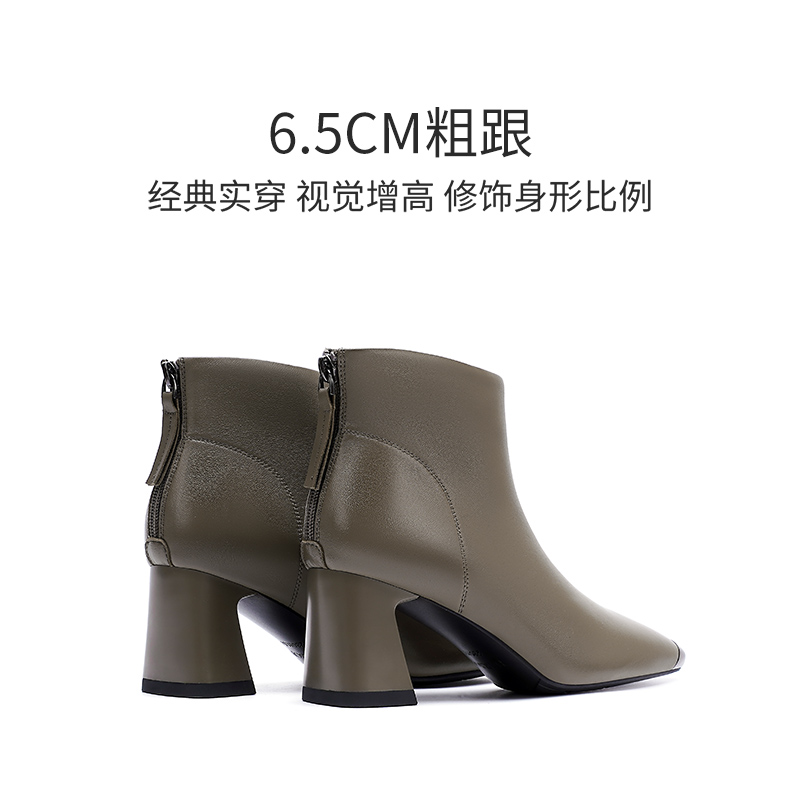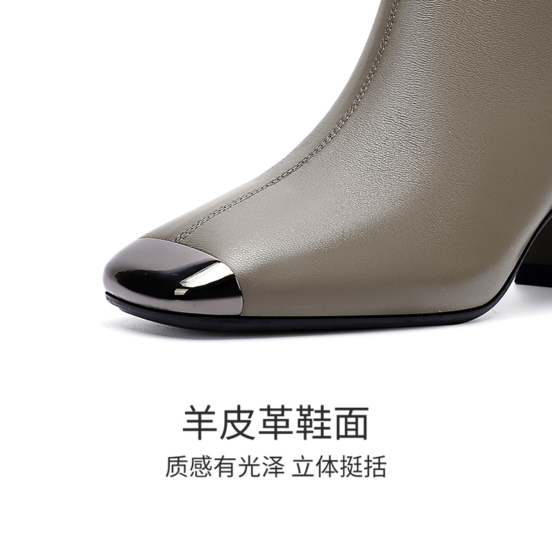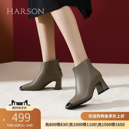 哈森防踢鞋头粗跟时装靴短靴秋冬新款方头羊皮女靴HWA240113