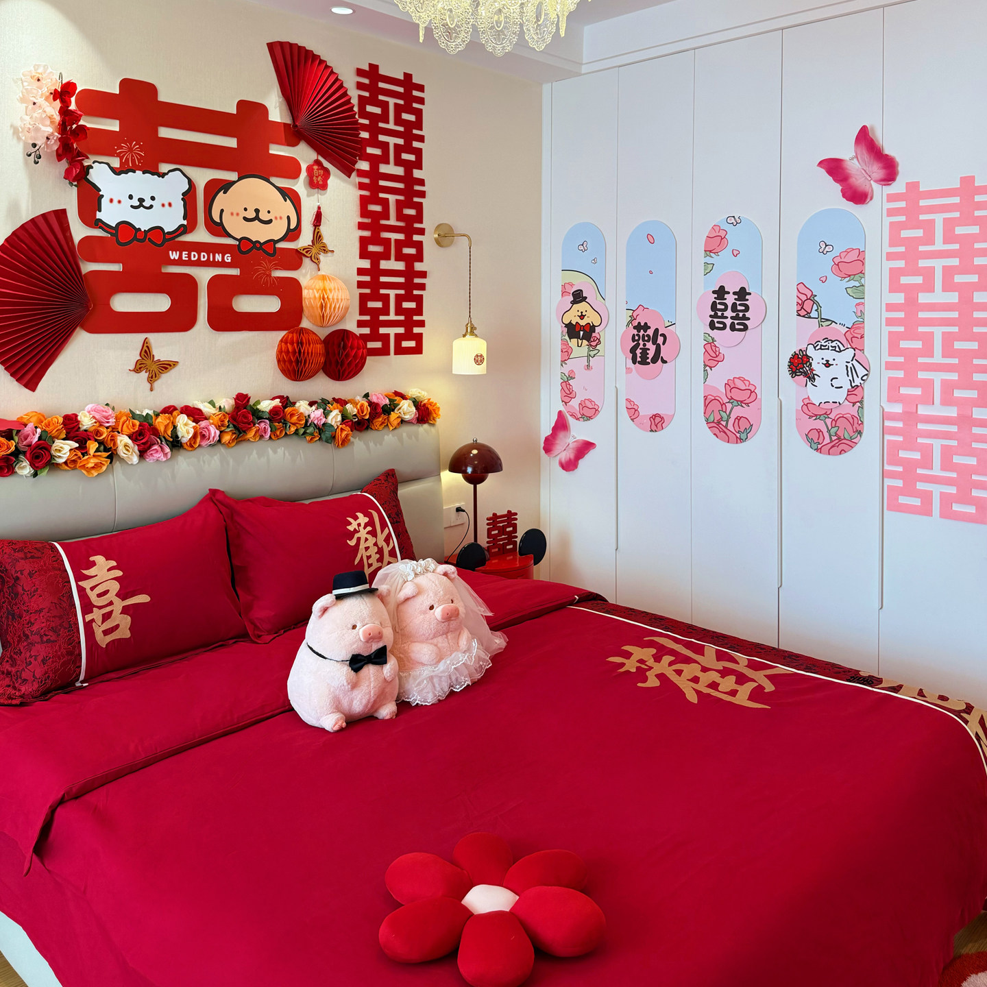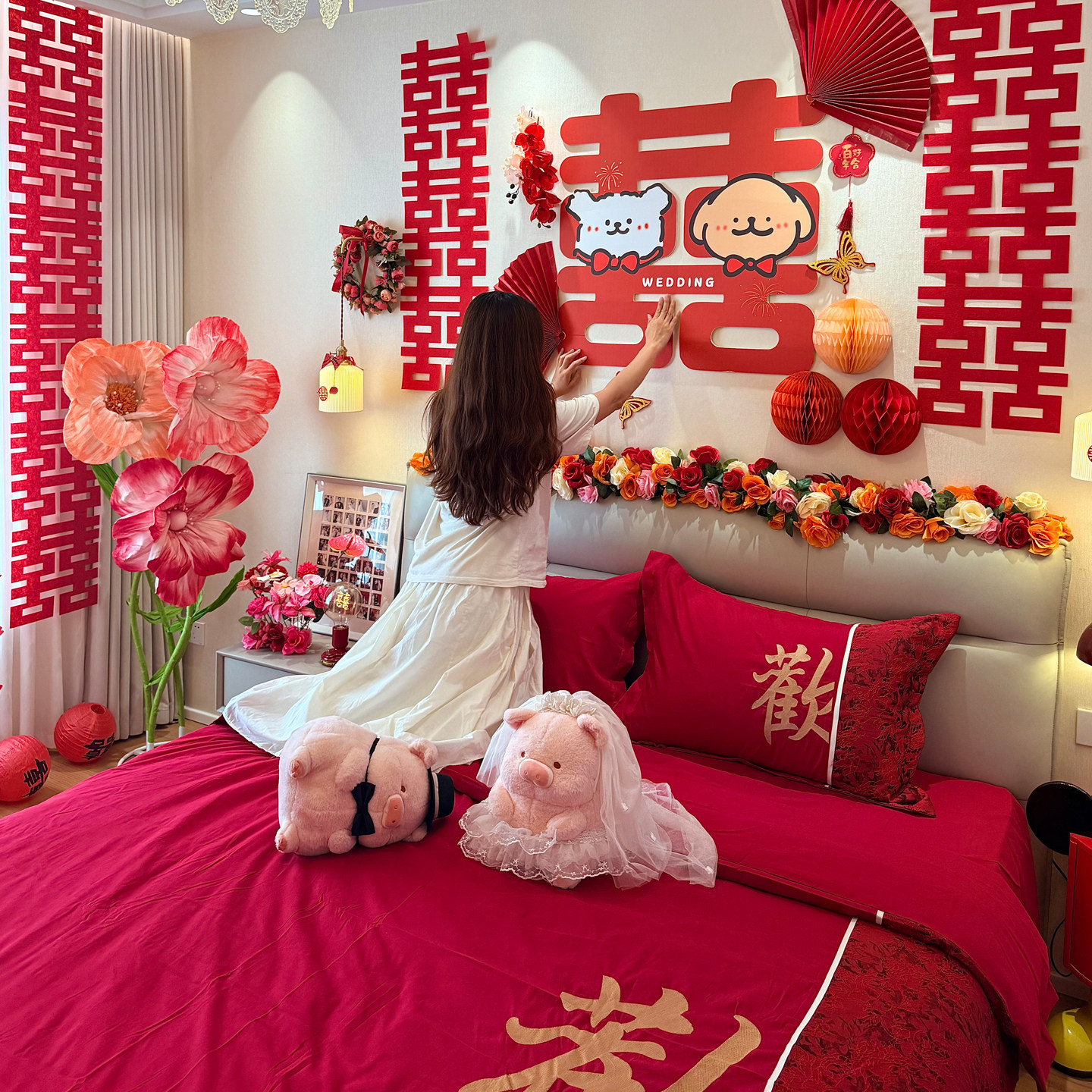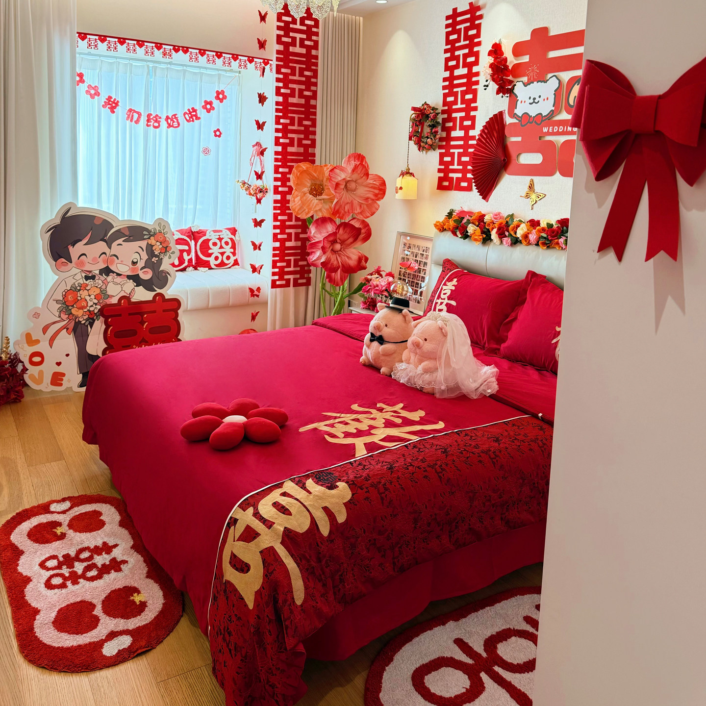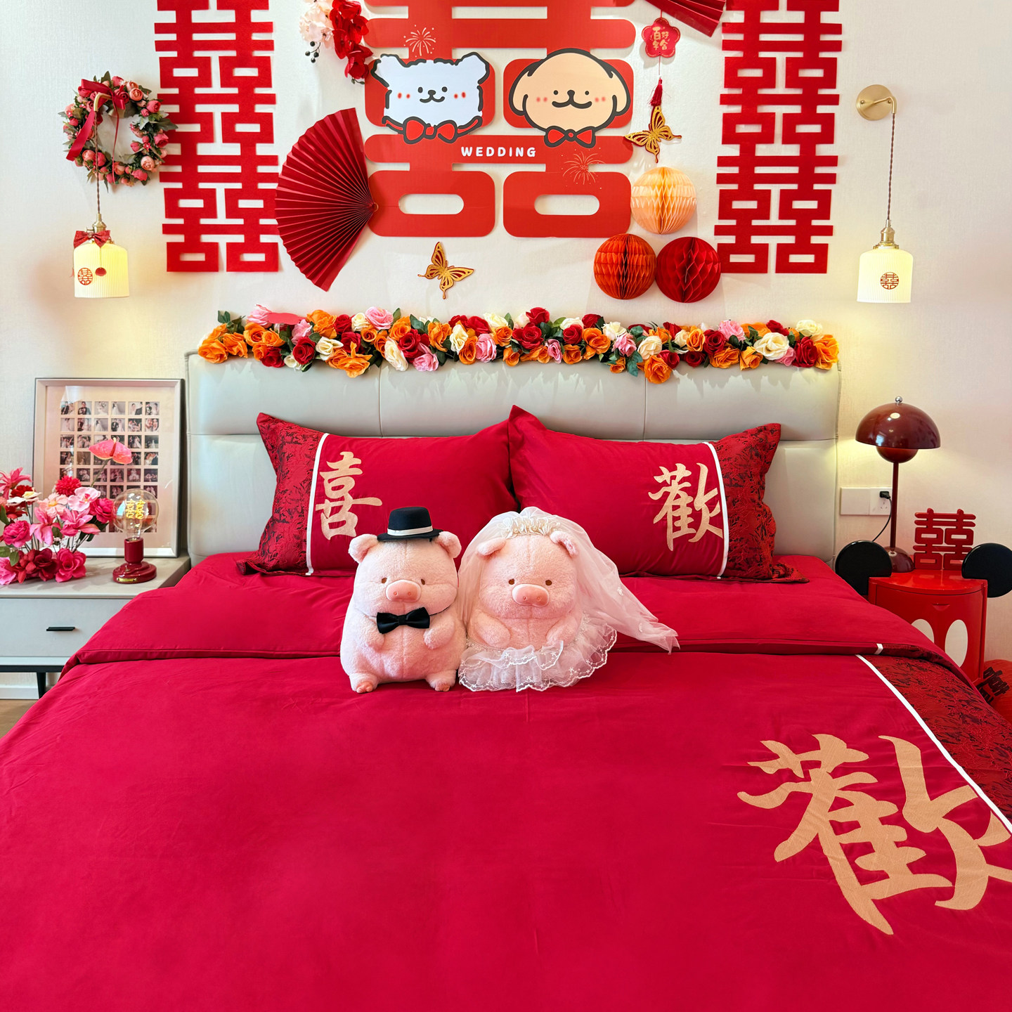 新中式红色结婚四件套新婚喜嫁床上用品喜字刺绣被套婚房陪嫁床单