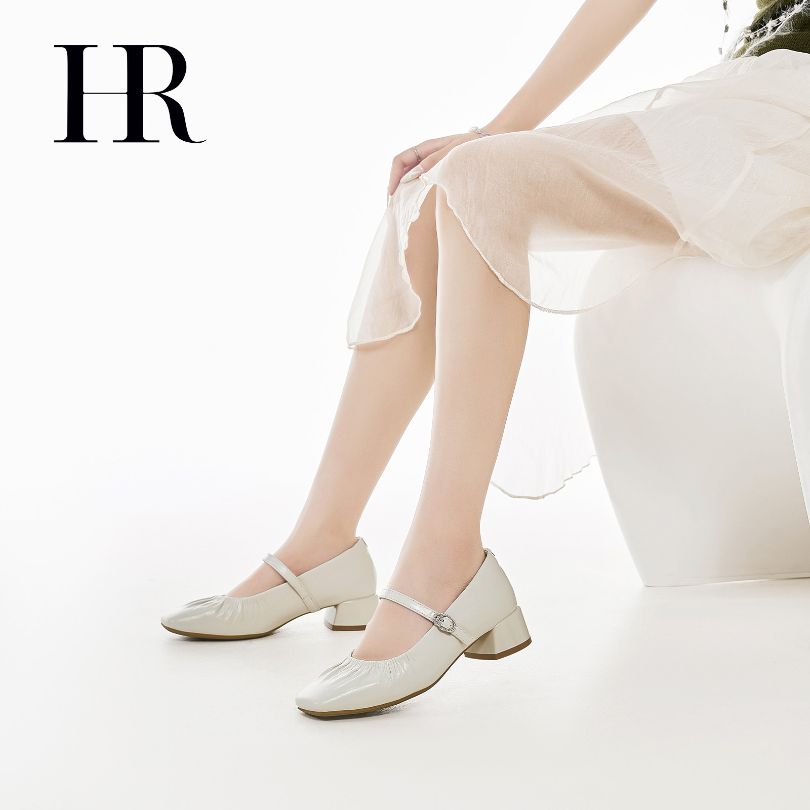 HR赫莲娜女鞋子2025夏季新款玛丽珍鞋粗跟方头牛皮一字扣浅口单鞋