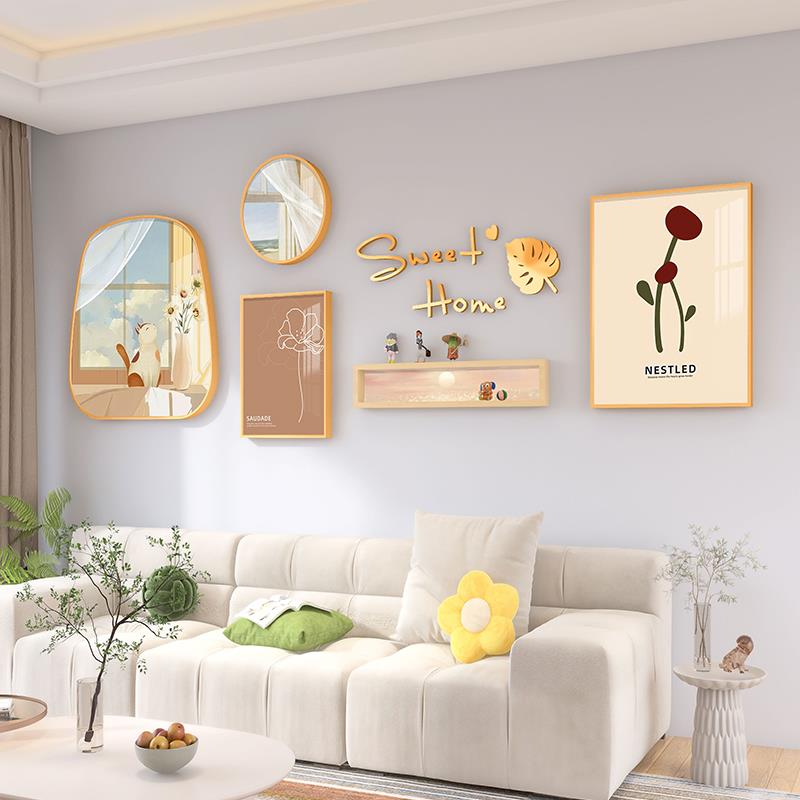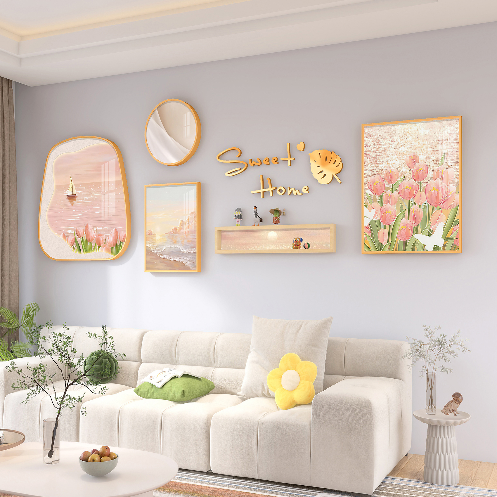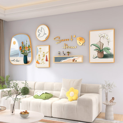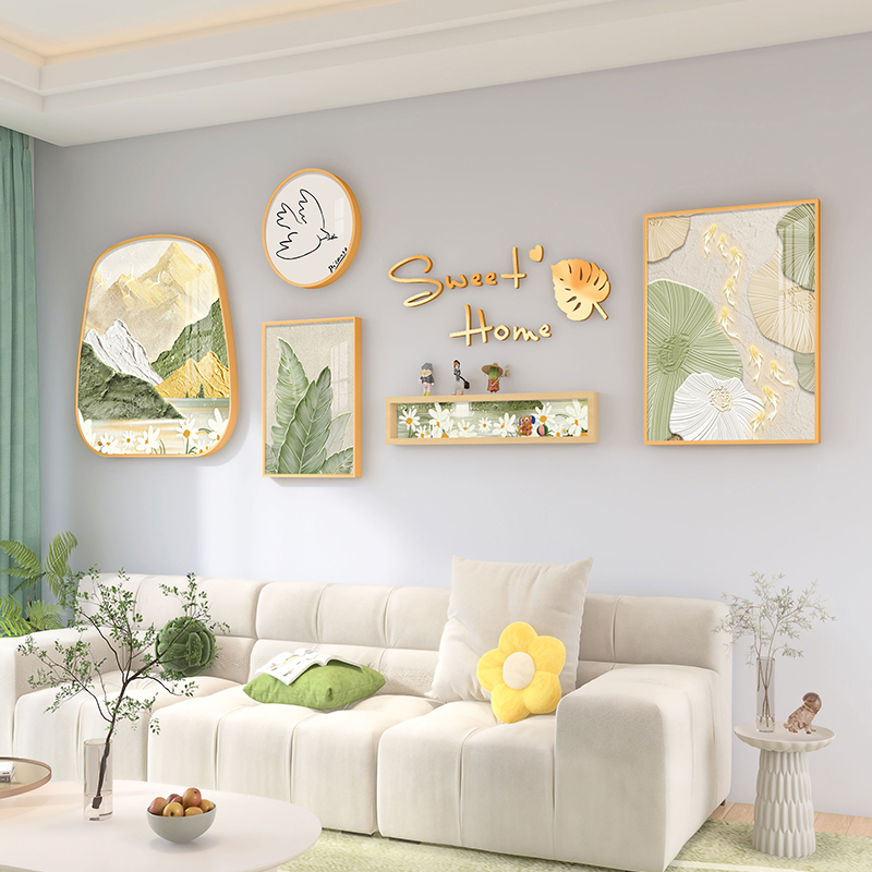 奶油风客厅组合装饰画现代简约小清新沙发背景墙壁画背靠金山挂画