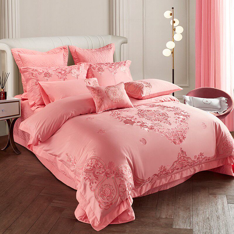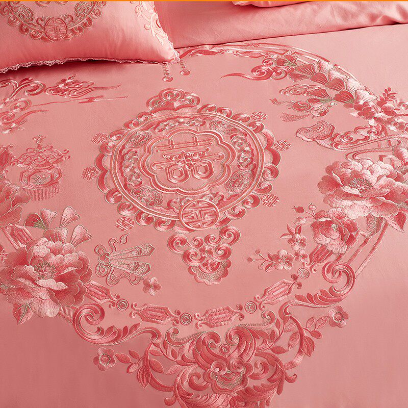 100支全棉婚庆四件套刺绣纯棉结婚粉色被套床单新婚六十床上用品