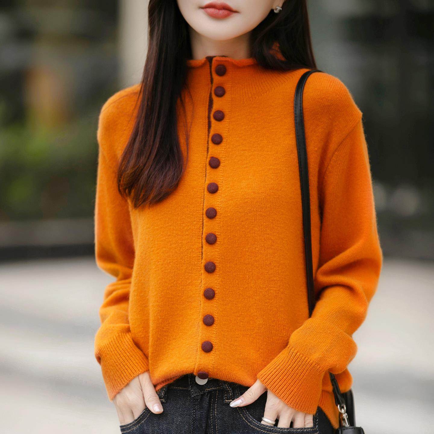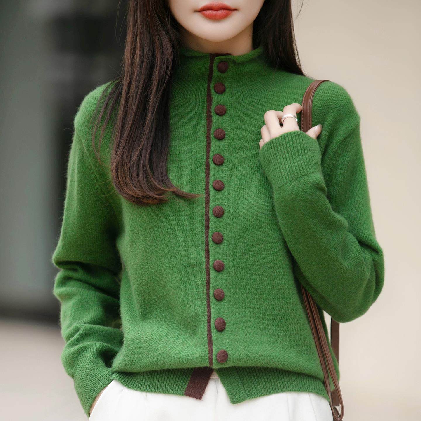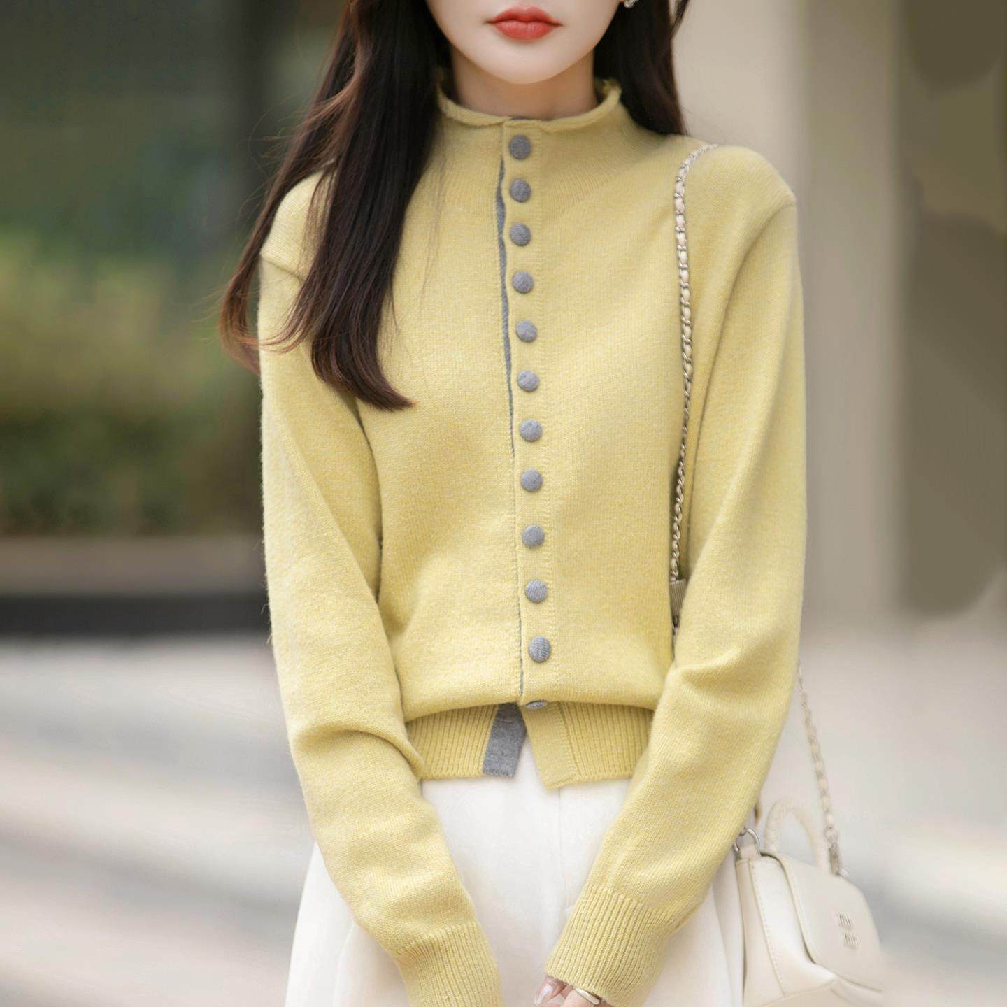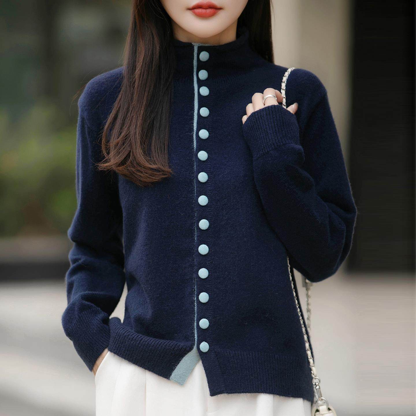 老钱风半高领彩扣撞色针织开衫女灰色毛衣洋气设计感加厚保暖打底