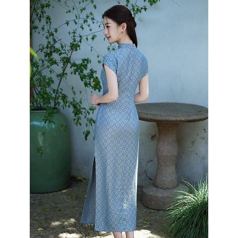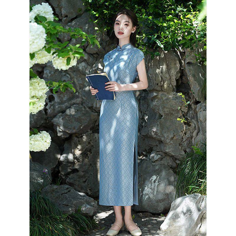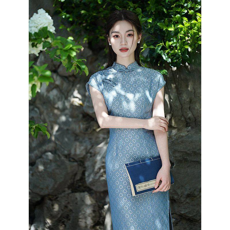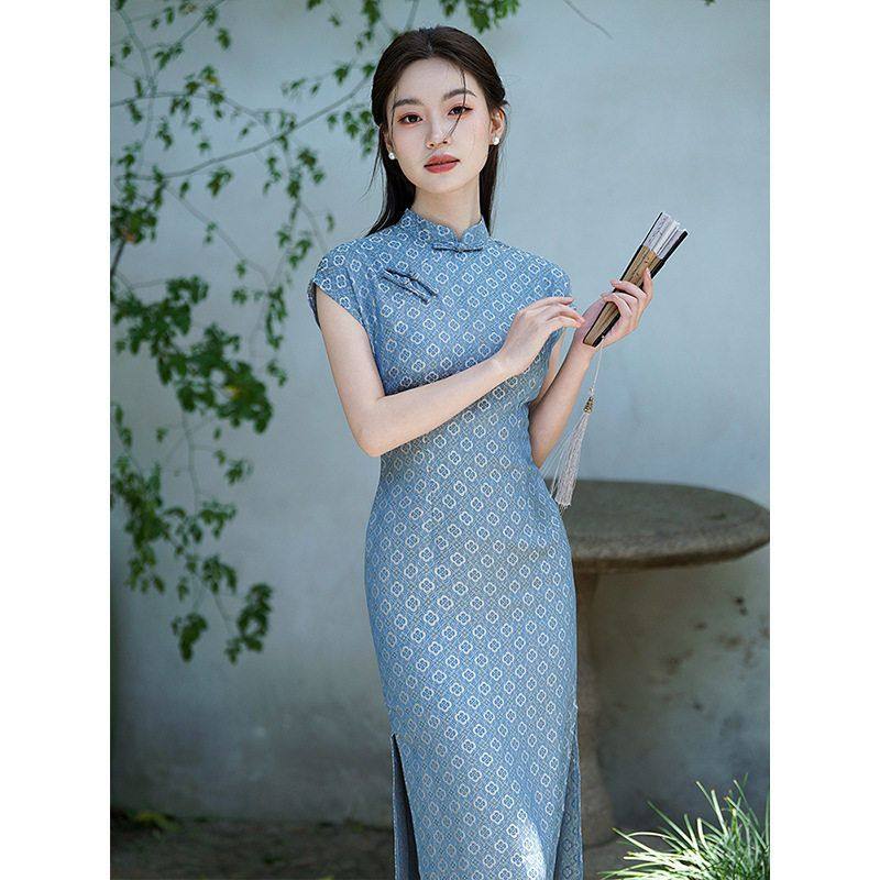 洛士仿正娟复古单修身连衣裙春夏女装2025旗袍中国风新款改良蓝色