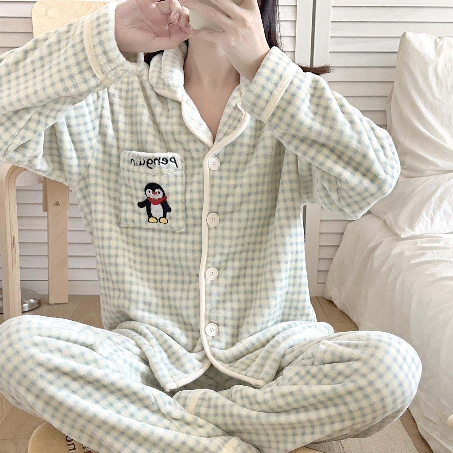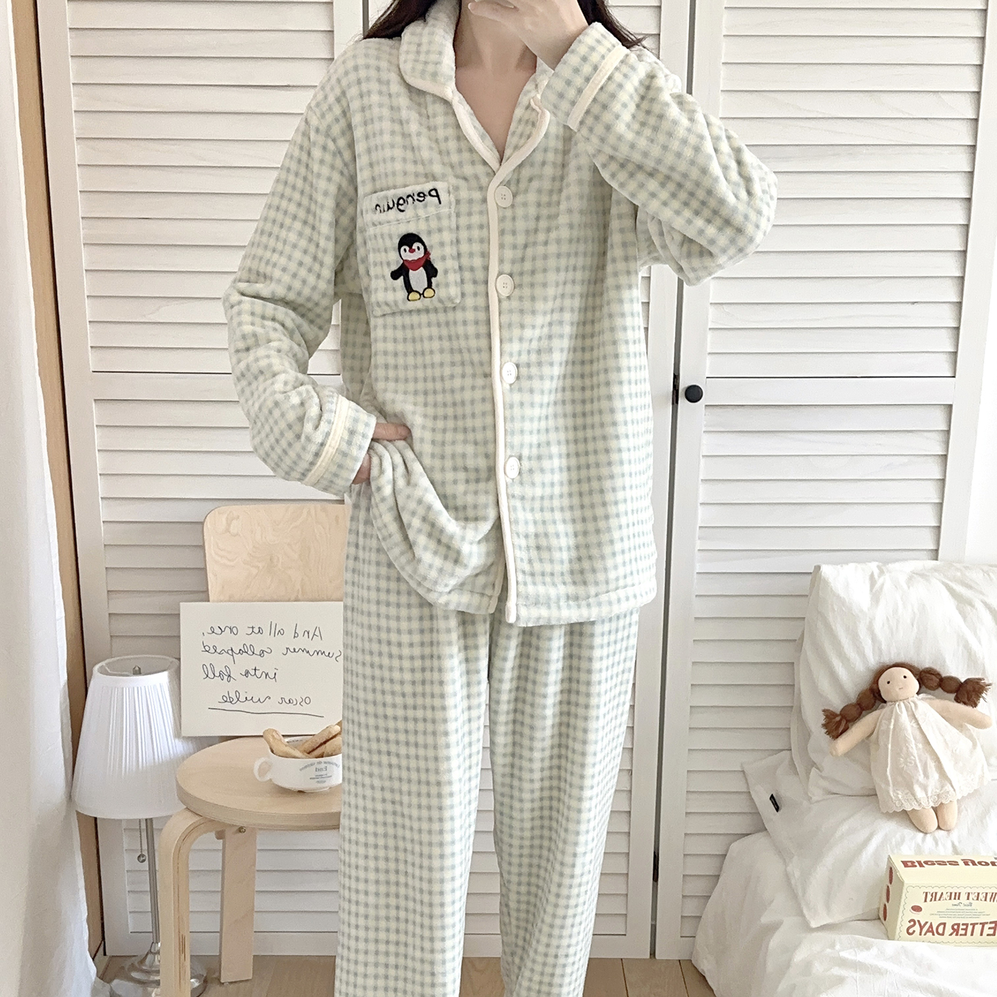 卡通格子珊瑚绒睡衣女款秋冬季加绒加厚保暖学生法兰绒家居服套装