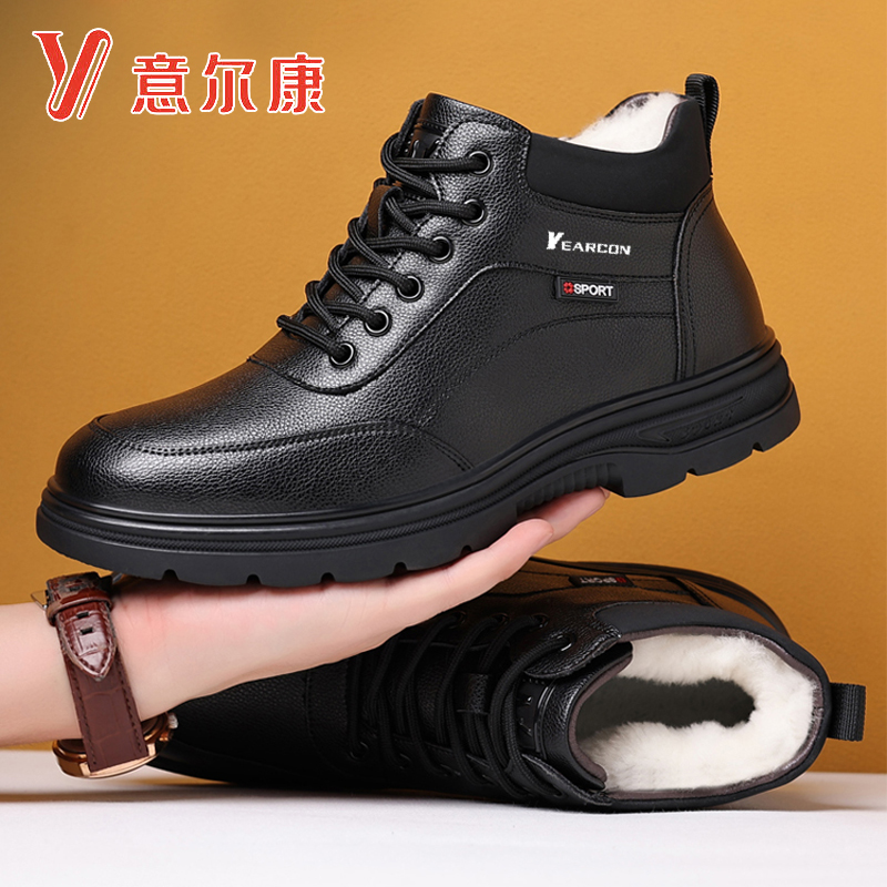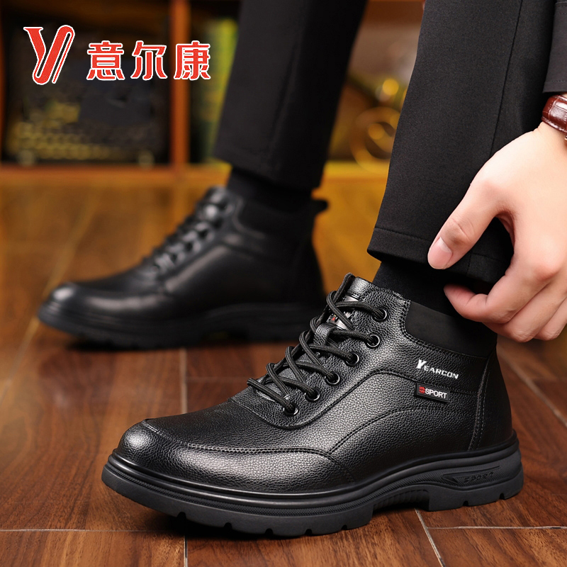 意尔康男鞋冬季加绒保暖高帮棉鞋真皮软底休闲皮鞋防滑中年爸爸鞋