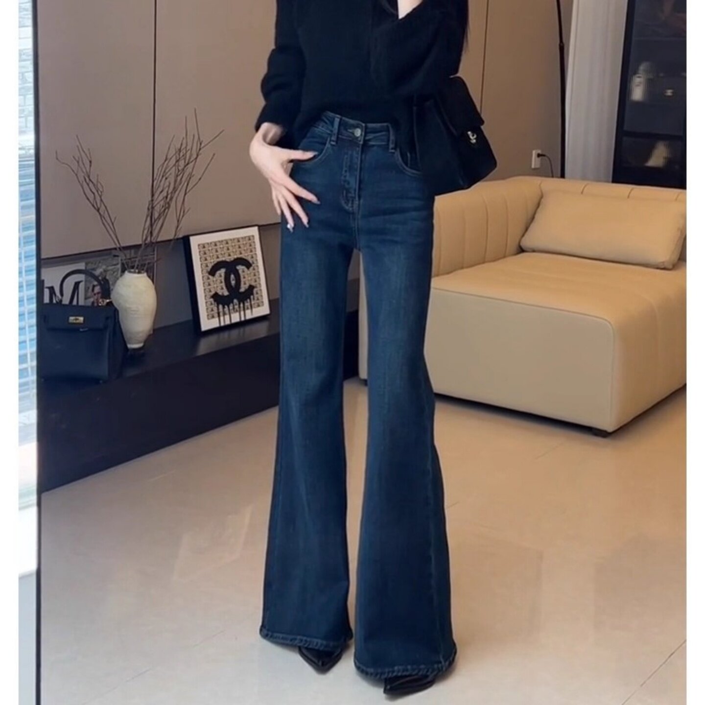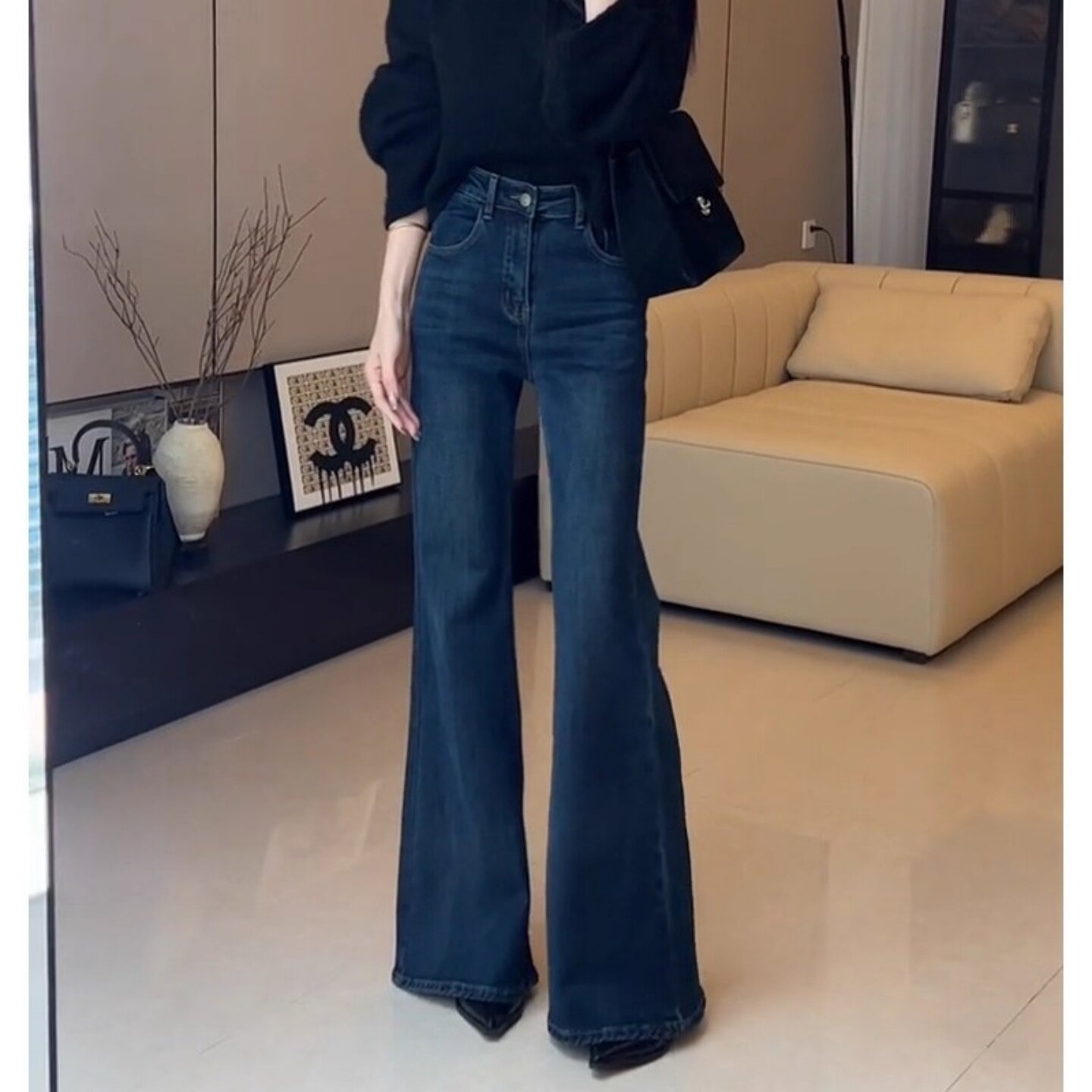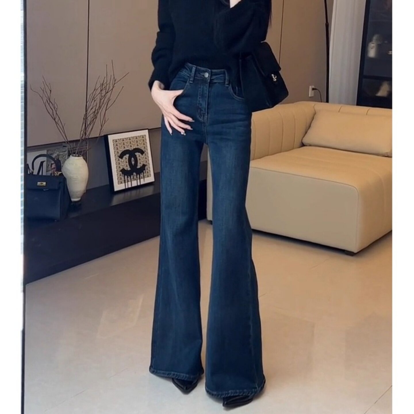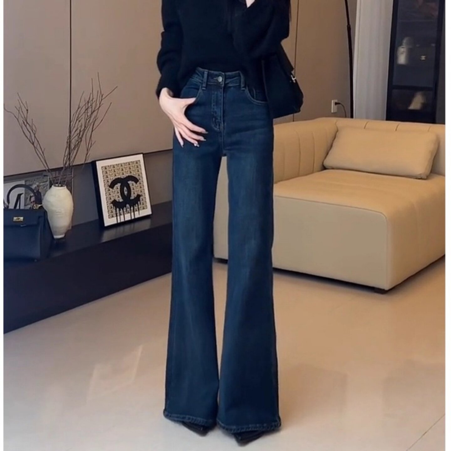 蓝色不贴腿加绒微喇牛仔裤女2025秋季新款高腰窄版直筒拖地喇叭裤