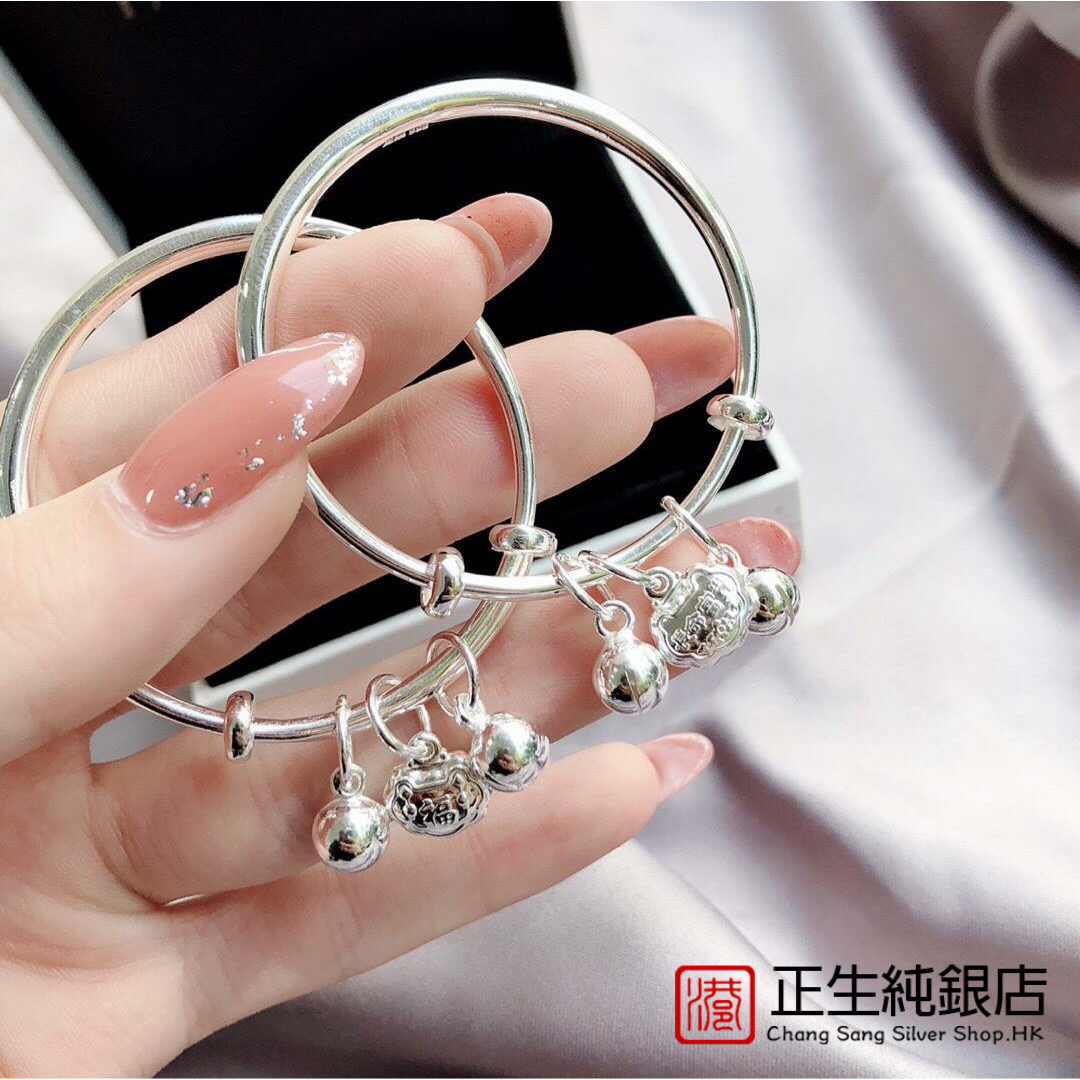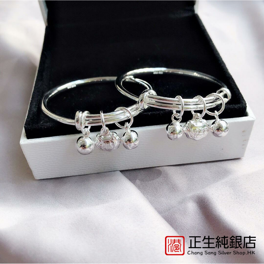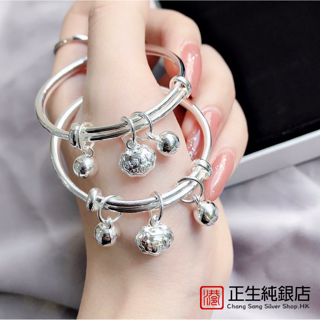 香港正生纯银s999足银光圈福字长命富贵铃铛推拉宝宝手镯儿童礼物