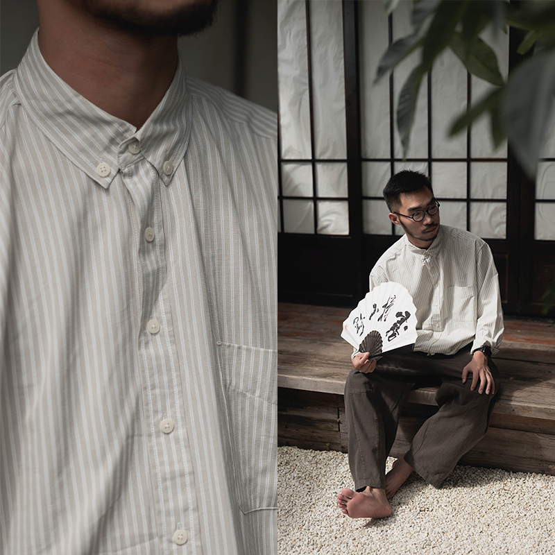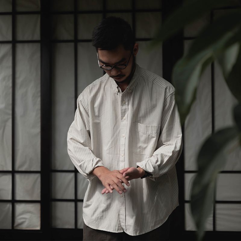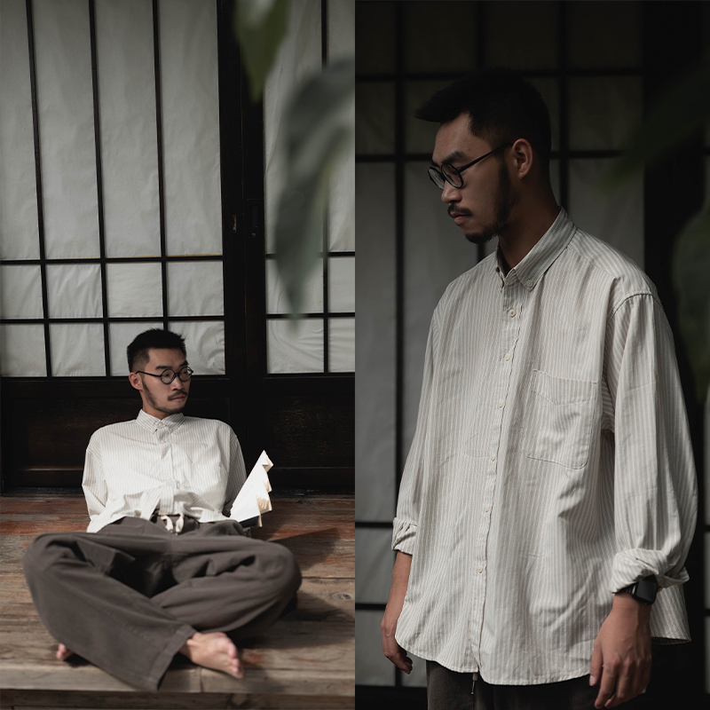 雾撞山野长袖条纹衬衫男春秋冷淡风日系文艺休闲宽松衬衣简约百搭