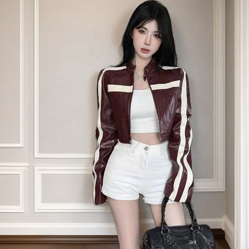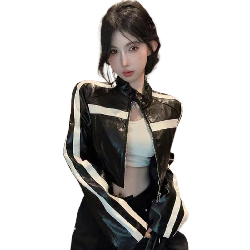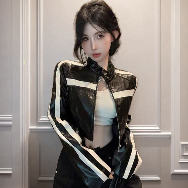设计感机车女孩美式复古拼接短款皮衣外套辣妹气质收腰外套春季