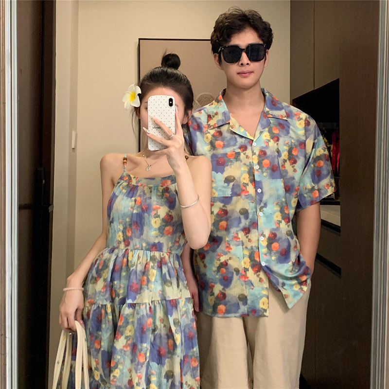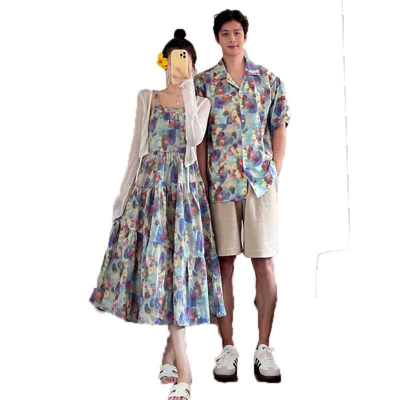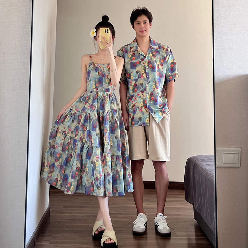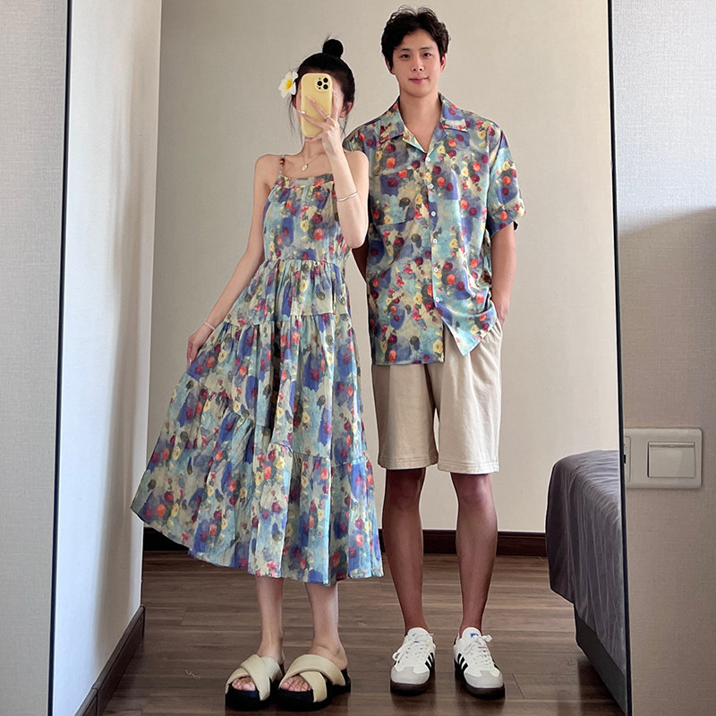 情侣装夏装2025新款高级感法式复古温柔风油画连衣裙女沙滩度假风