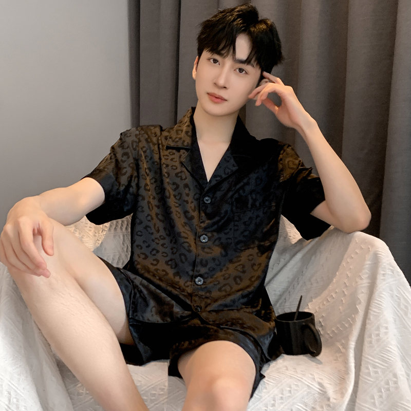 睡衣男冰丝夏季短袖短裤薄款黑色豹纹高级感加大码男生丝绸可外穿