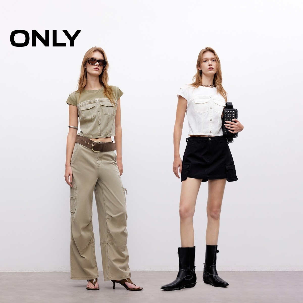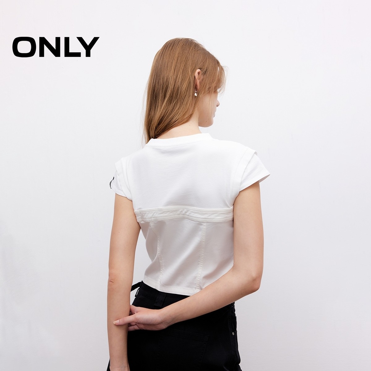 ONLY2025夏季新款纯色拼接面料时髦双层袖设计显瘦圆领短袖T恤女