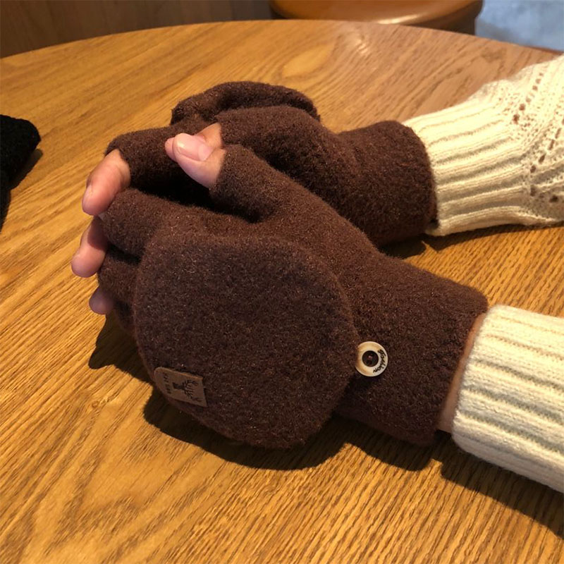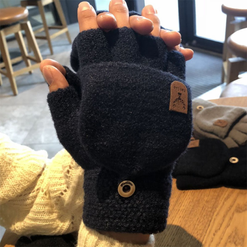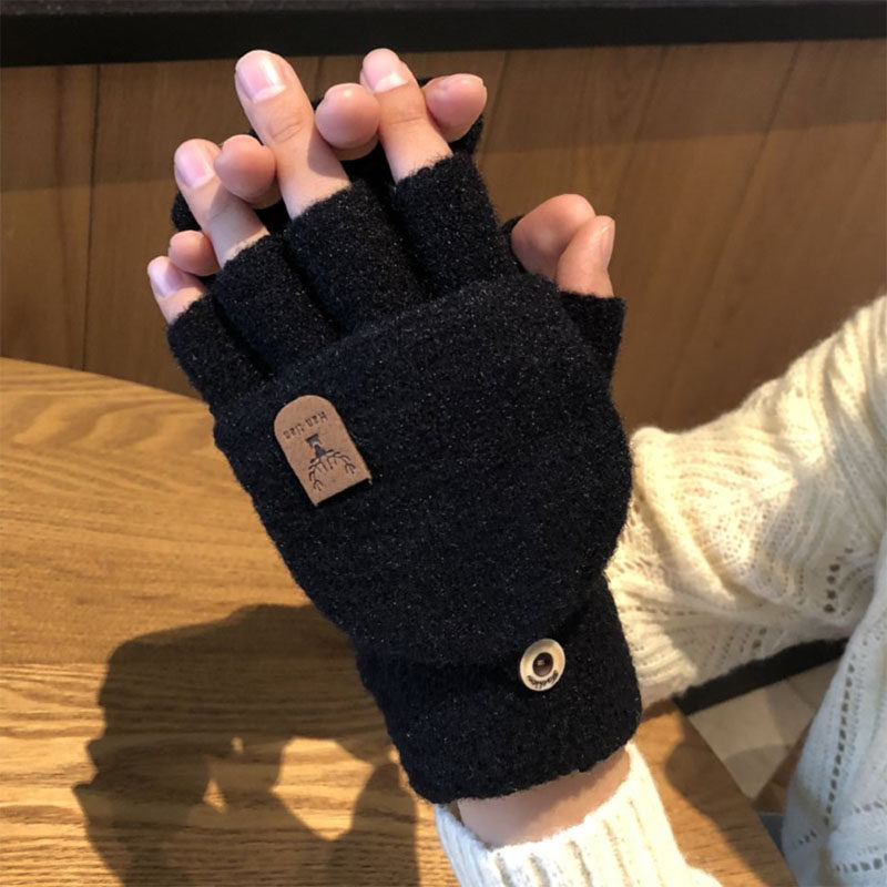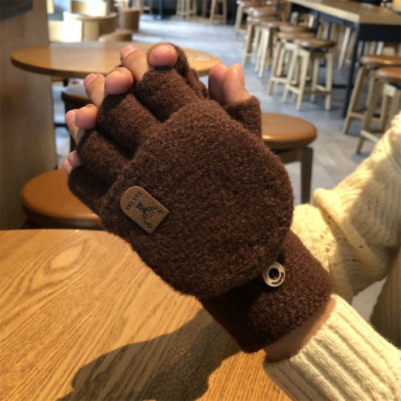 手套男秋冬季针织骑行翻盖学生冬天加厚写字半指保暖防寒棉手套女