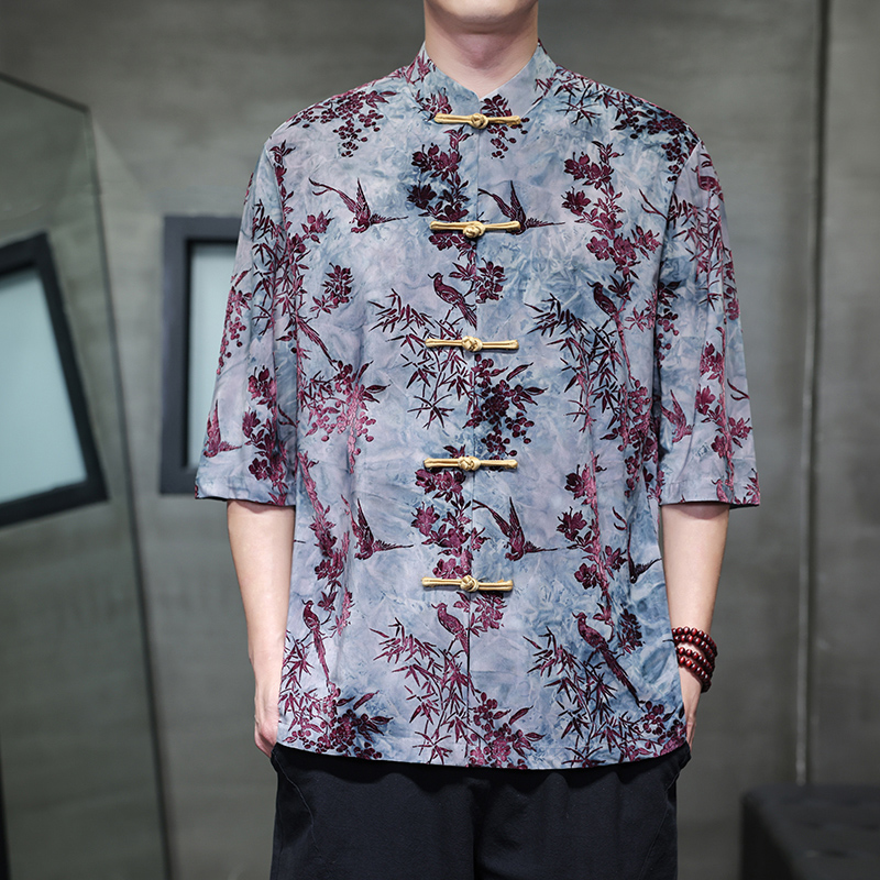 中国风男装复古盘扣圆领中山装夏季薄款短袖衬衫男新中式唐装国潮