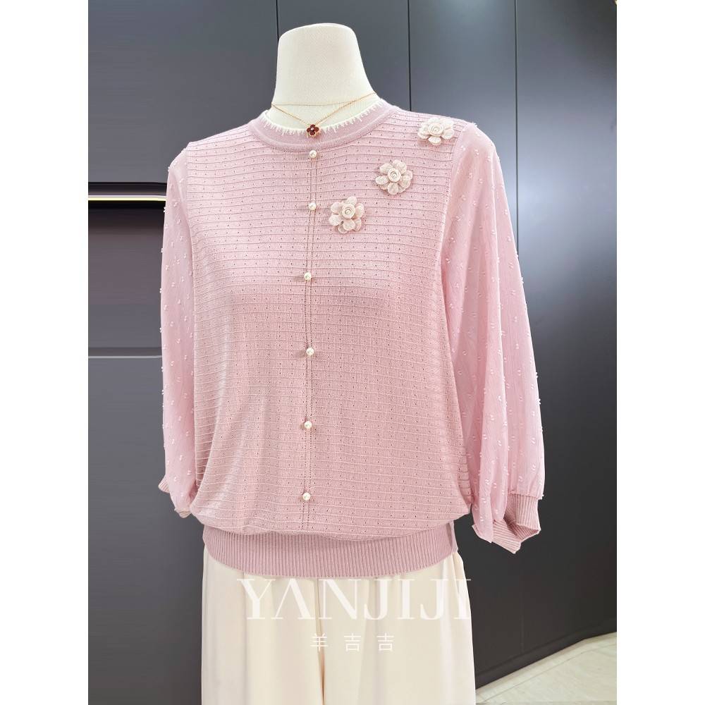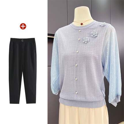 妈妈秋装纱袖洋气小衫薄款上衣中老年时尚女装外穿打底针织雪纺衫