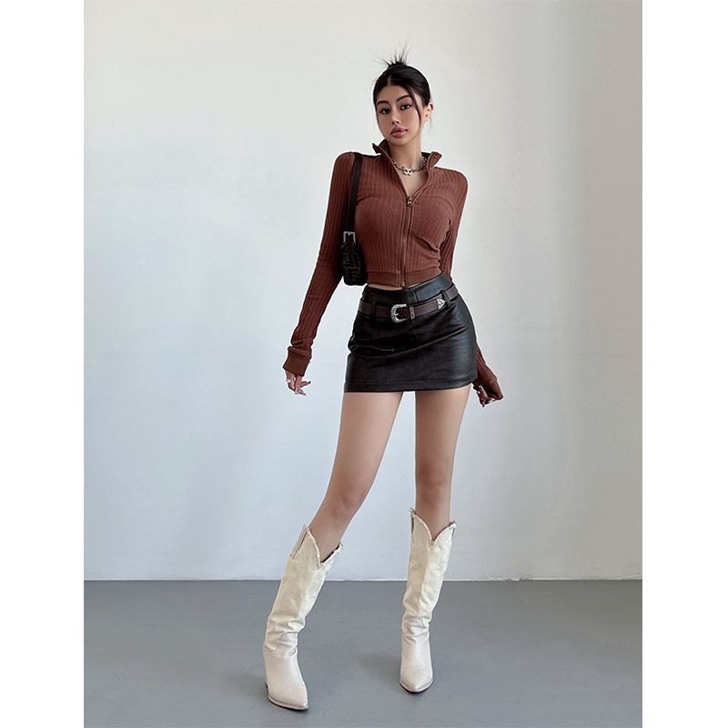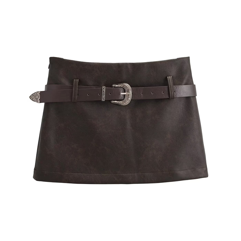 liviahome街头复古辣妹腰带包臀皮裙女机能风超短裙A字半身裙秋冬