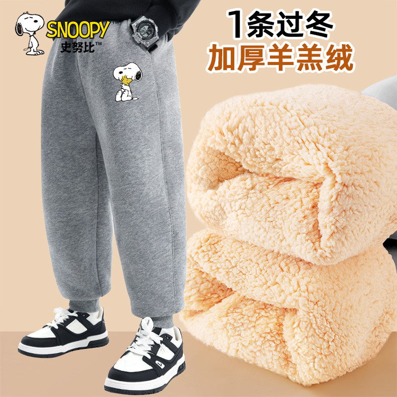 史努比童装儿童羊羔绒裤子男童冬季加绒卫裤棉裤男孩加厚一体绒裤