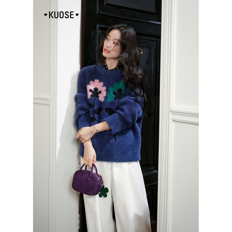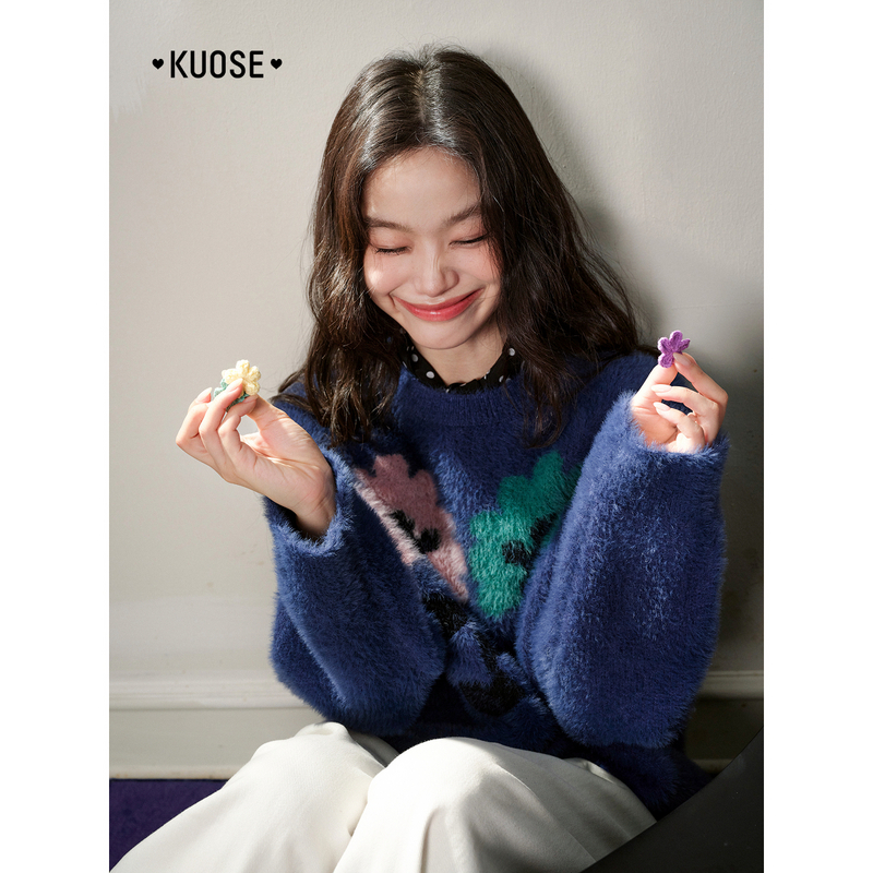 阔色蓝色仿马海毛毛提花针织衫女2025秋冬季新款内搭打底衫毛衣