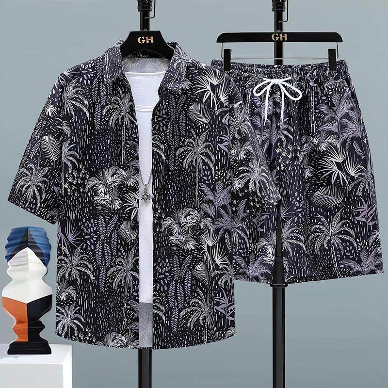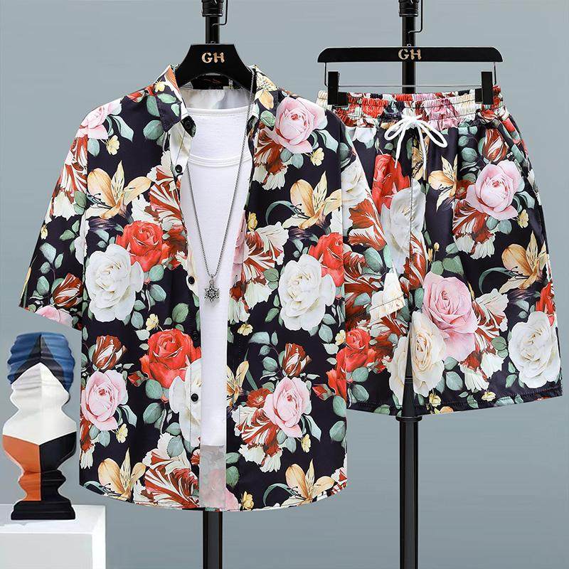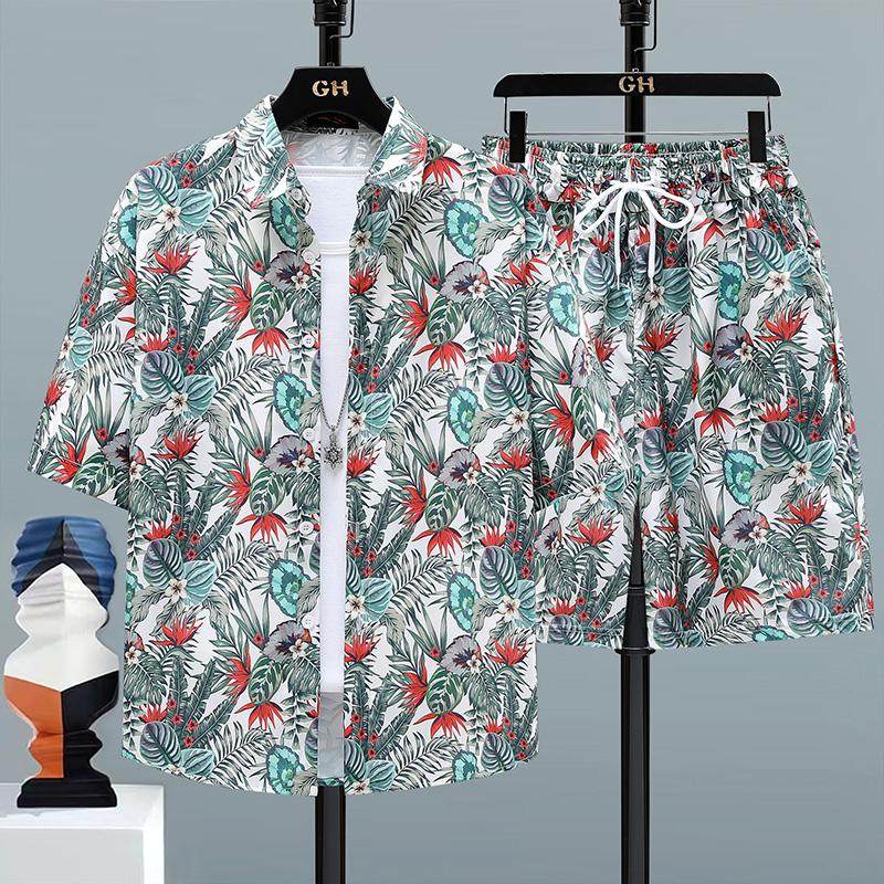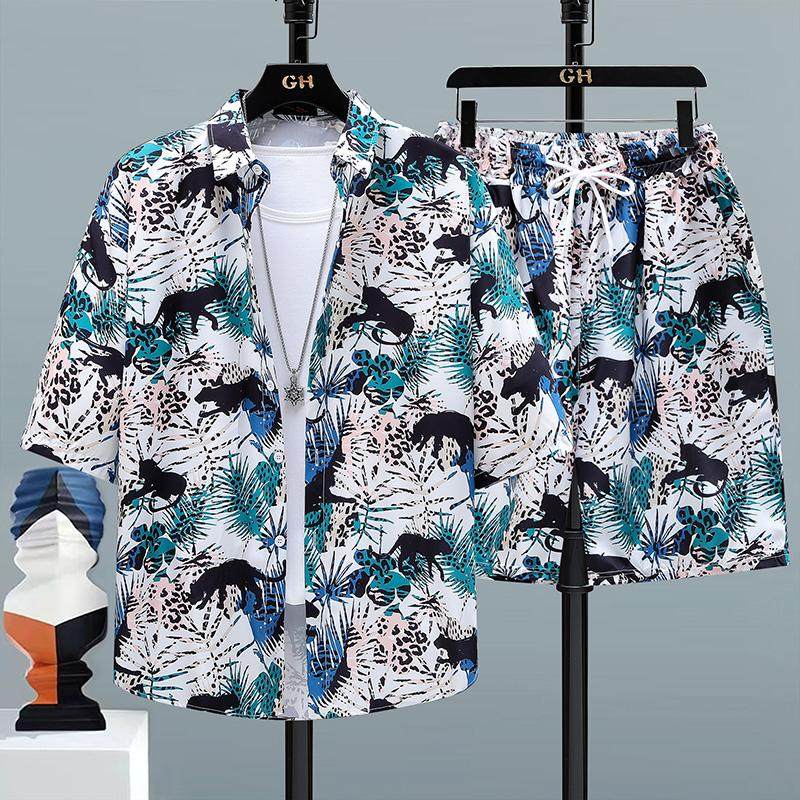 夏季情侣款套装男女复古短袖花衬衫潮流海边旅游衬衣沙滩五分短裤