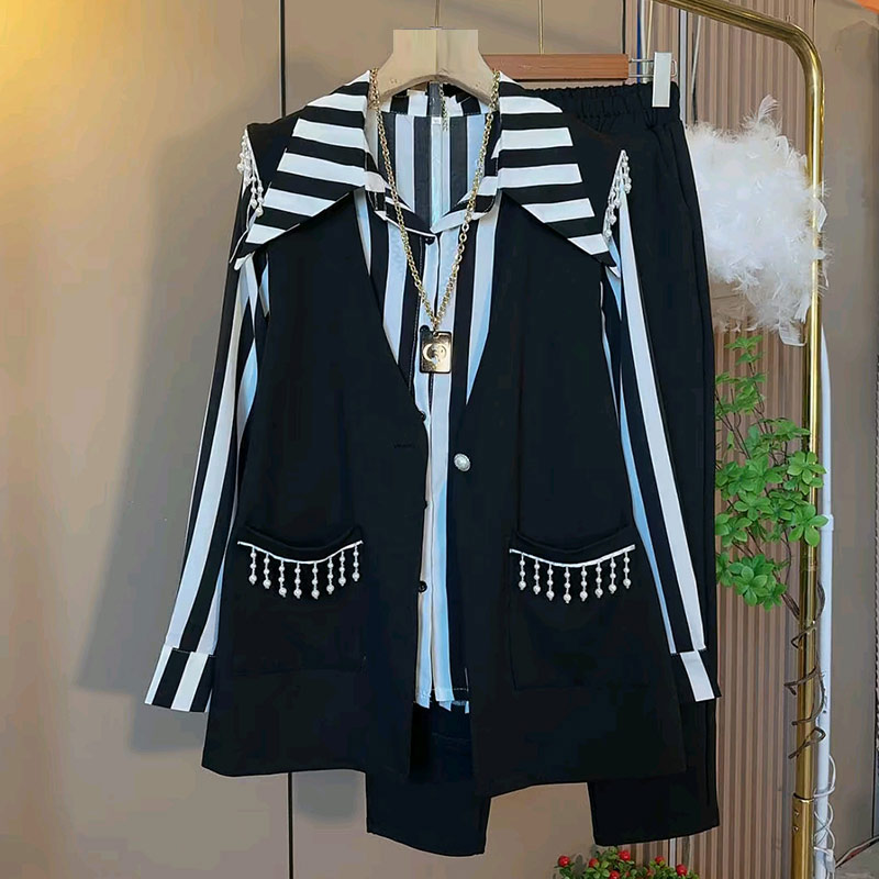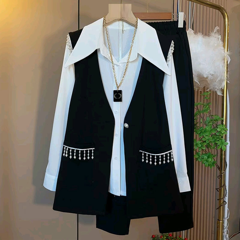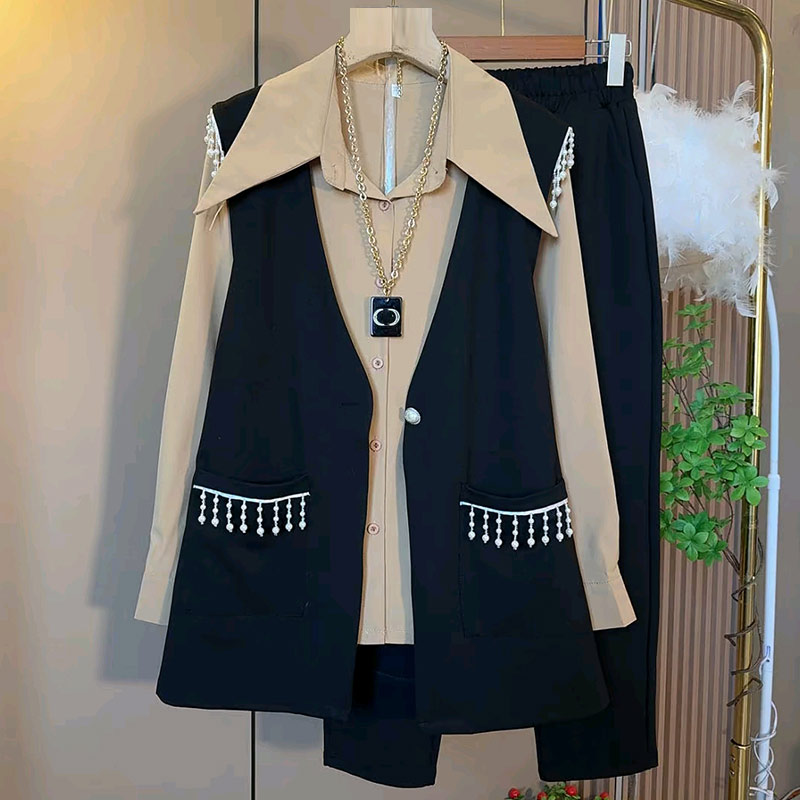 大码女装流苏兜V领马甲翻领长袖衬衫松紧腰裤子胖妹妹通勤三件套