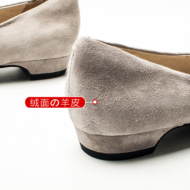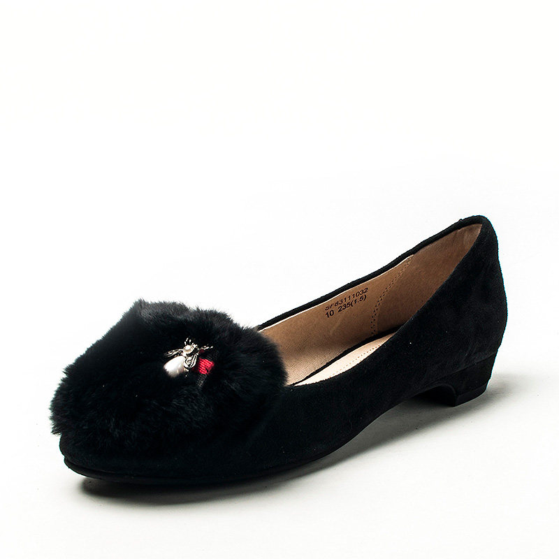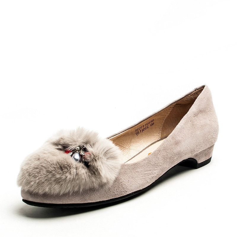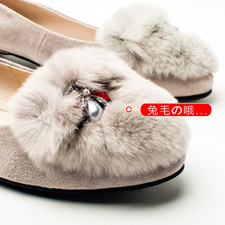 羊猄真皮女鞋子灰色羊皮兔毛毛单鞋低跟圆头蝴蝶结珍珠SF83111032