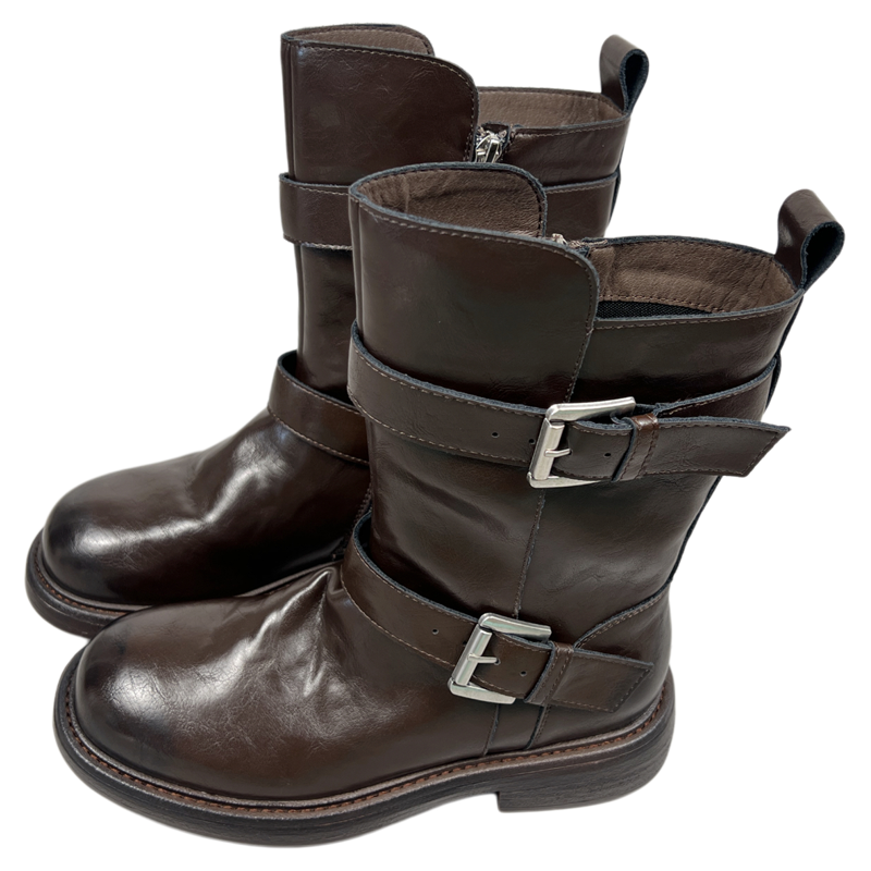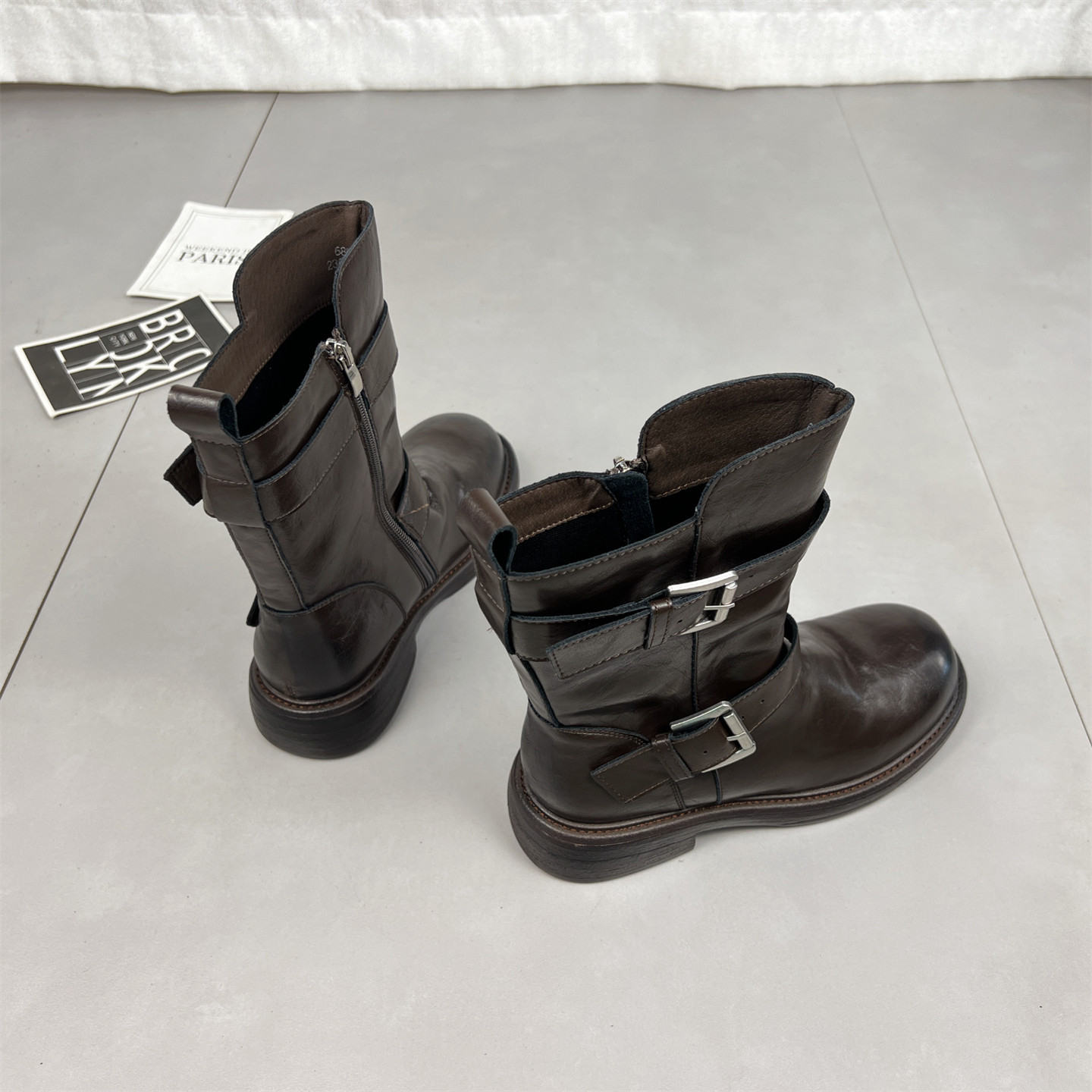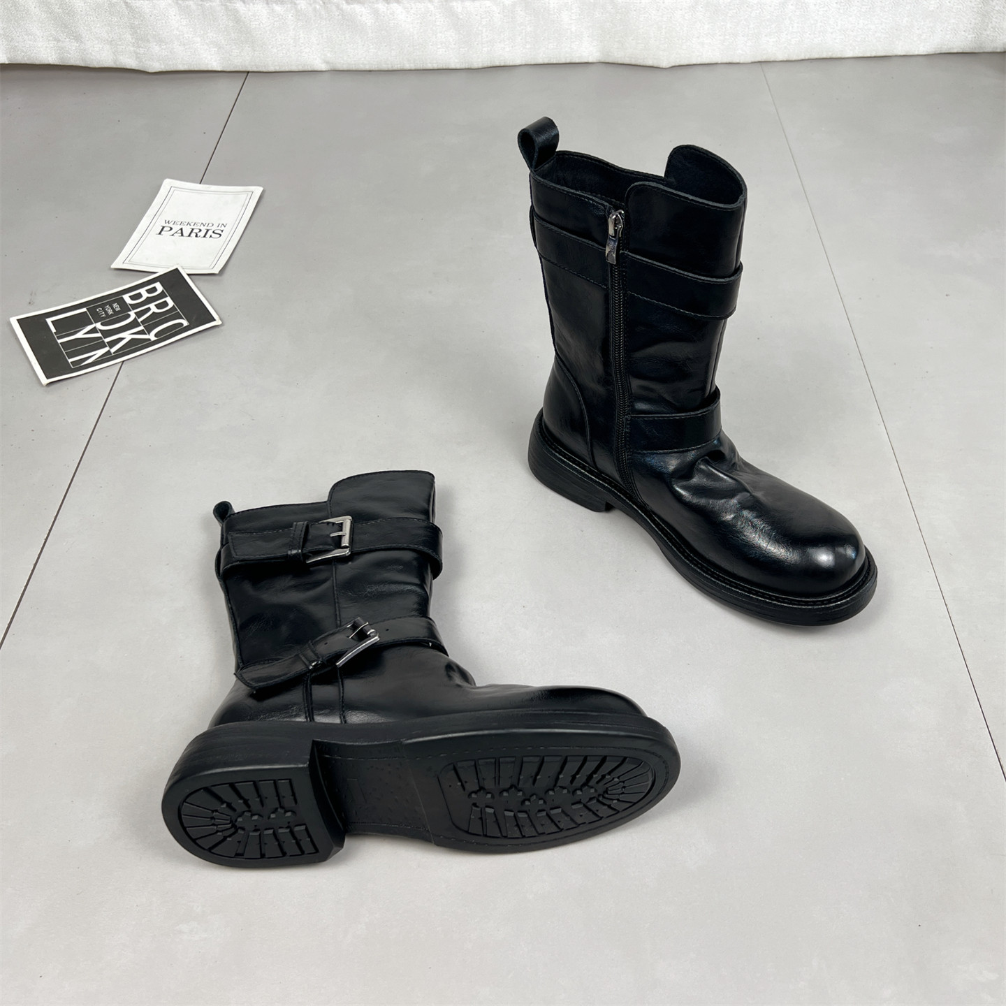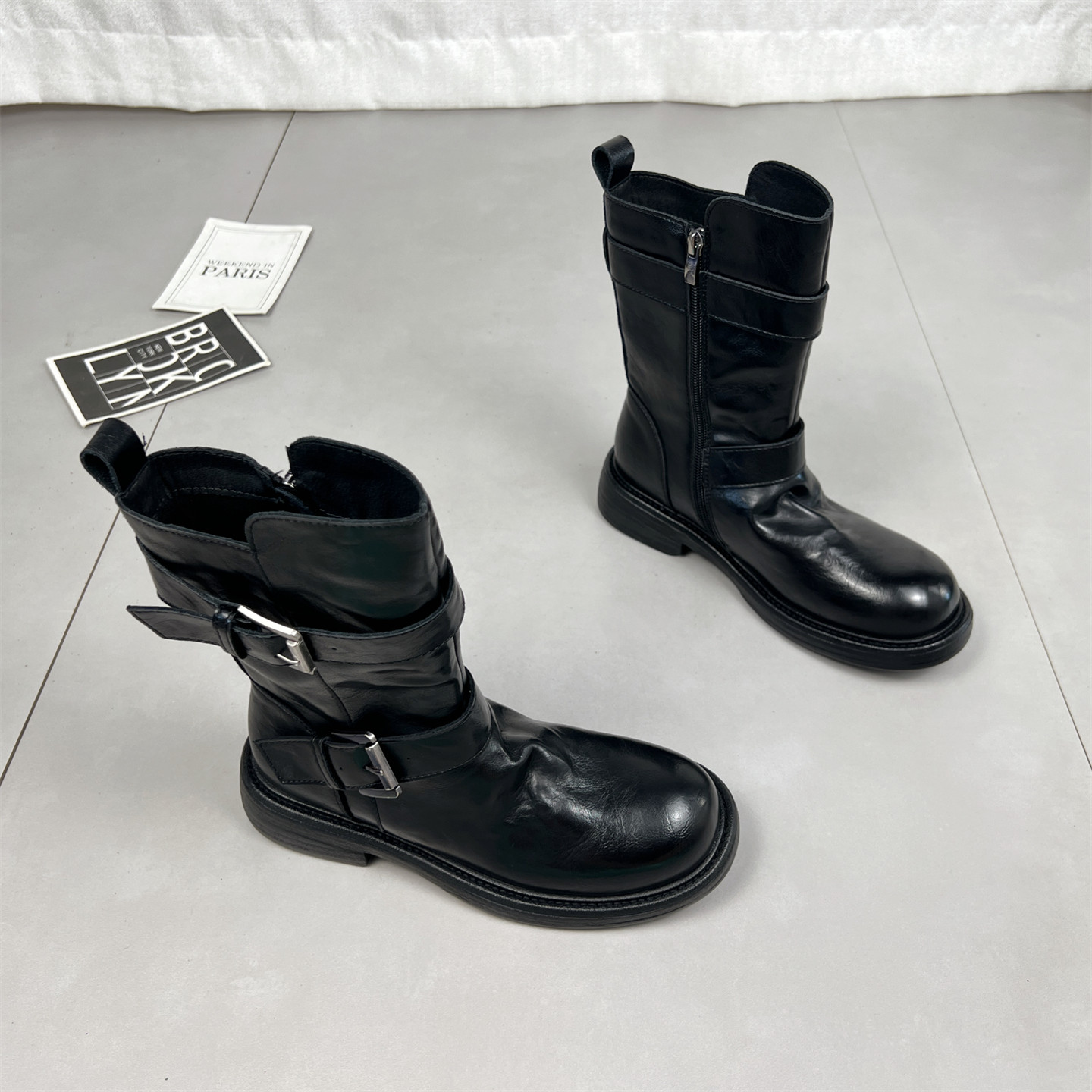 真皮皮带扣褶皱马丁靴女2025秋冬新款百搭显瘦厚底短靴显瘦机车靴