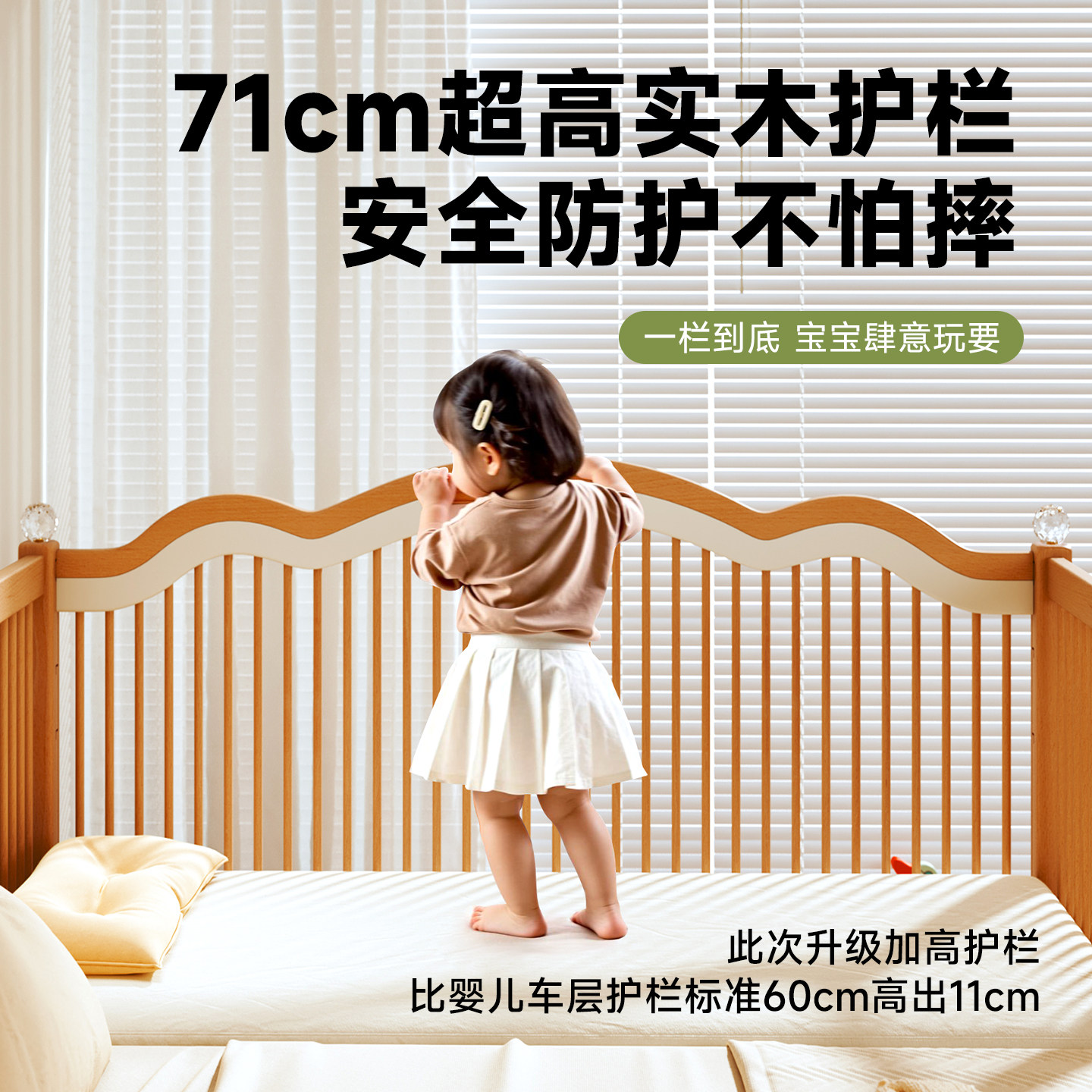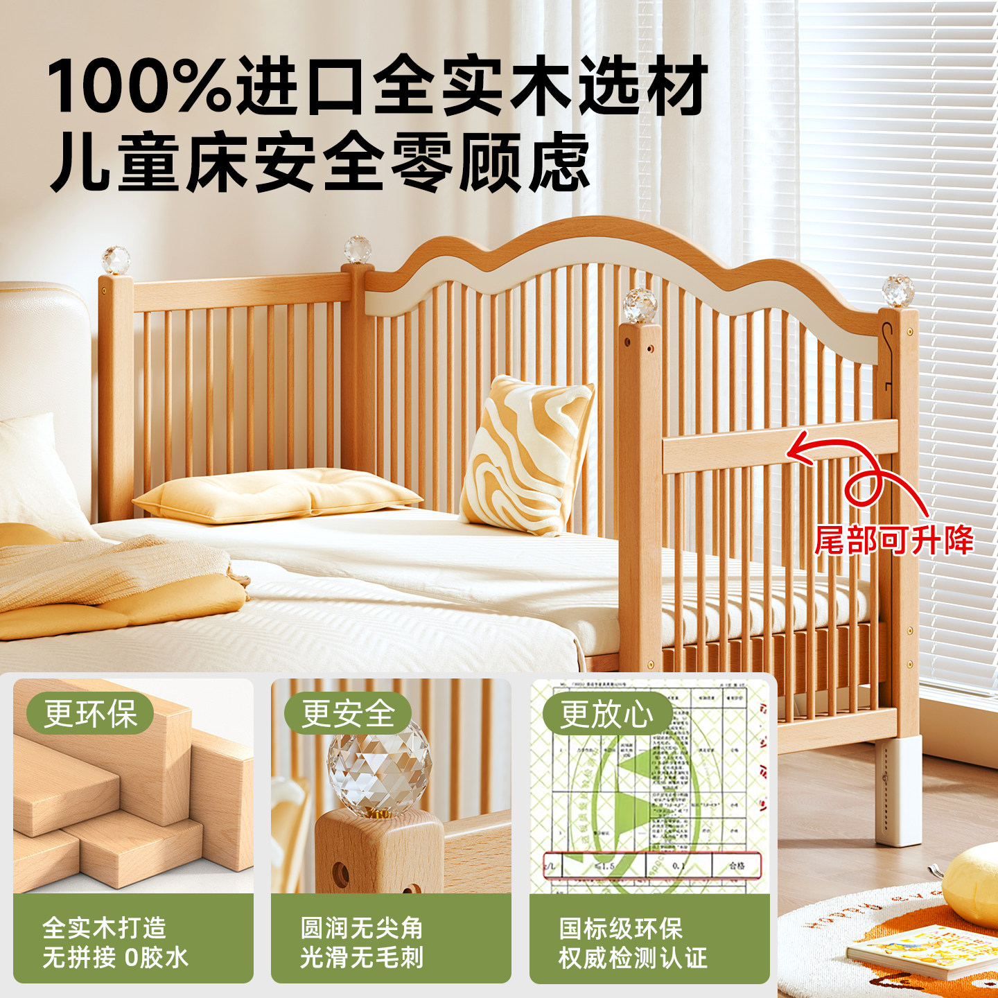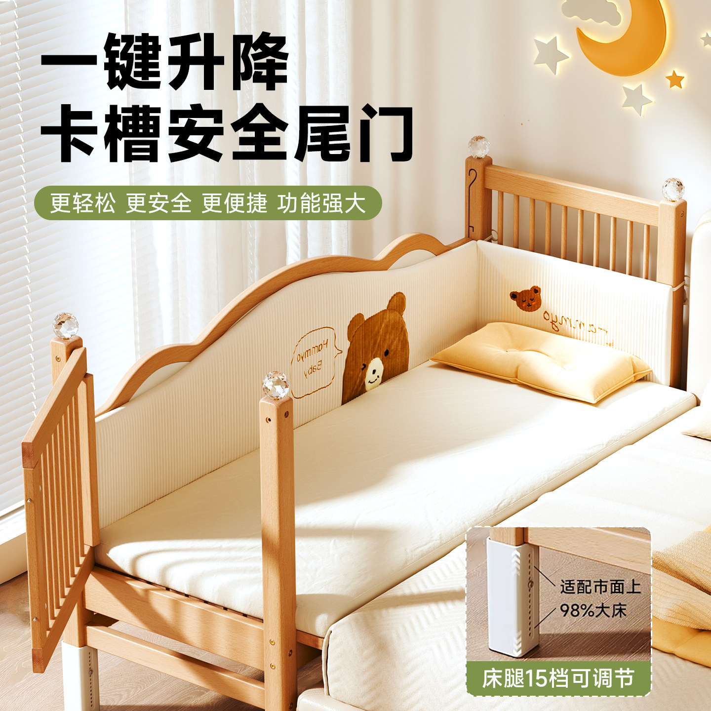 贝寝榉木拼接床婴儿实木床升降护栏宝宝小床儿童床边加宽大人可睡
