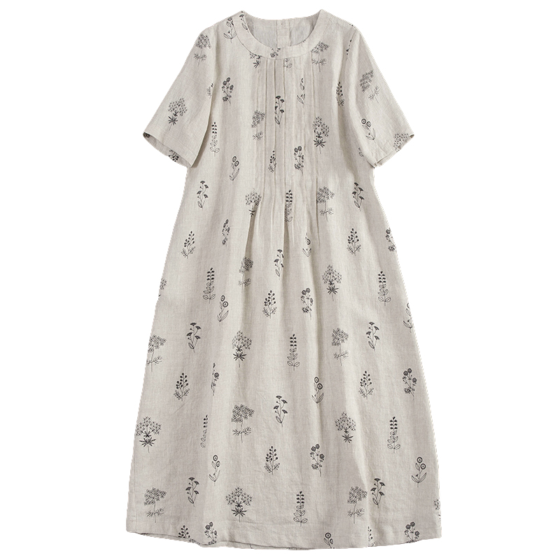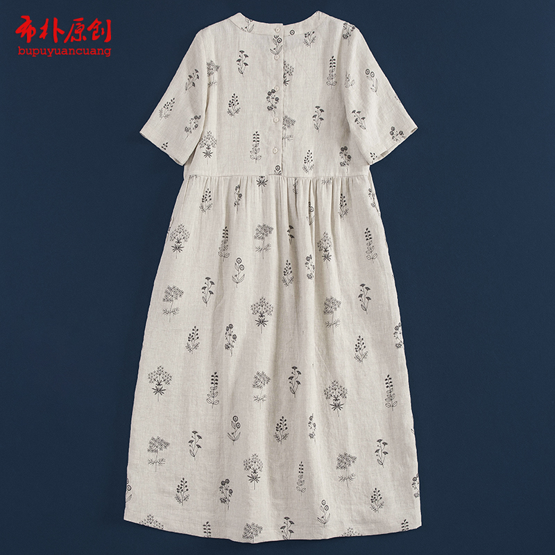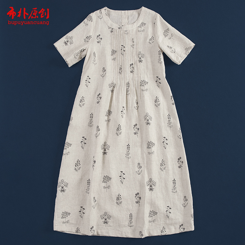 布朴家作2025夏新新款文艺亚麻印花圆领短袖连衣裙显瘦中长款裙子