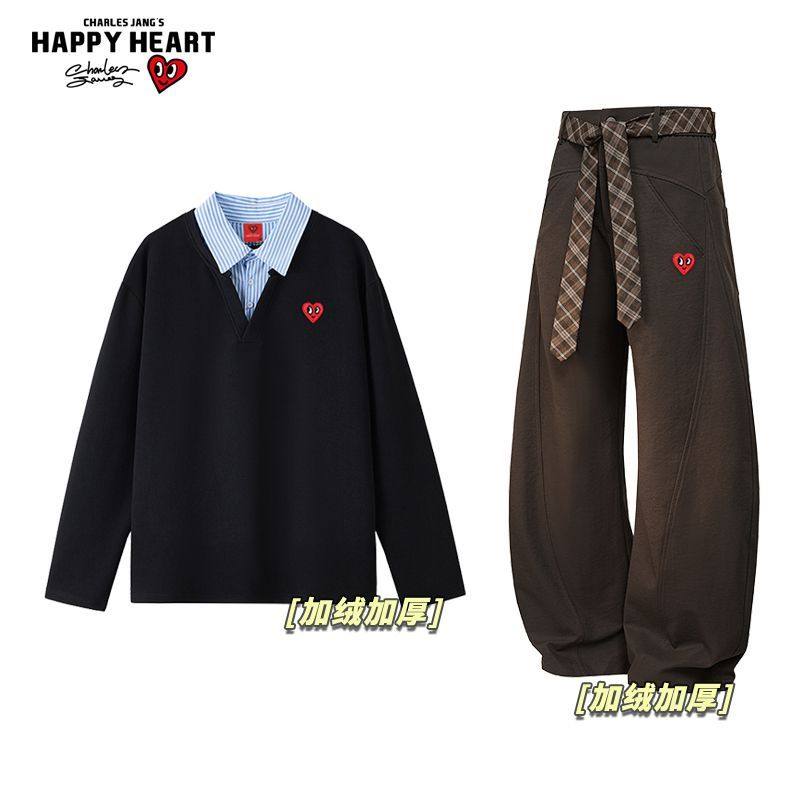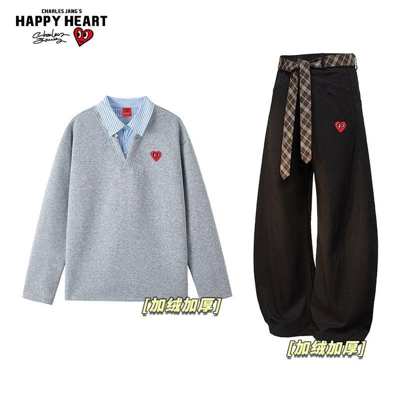 查尔斯桃心加绒加厚休闲套装冬季男女假两件卫衣宽松直筒休闲裤子