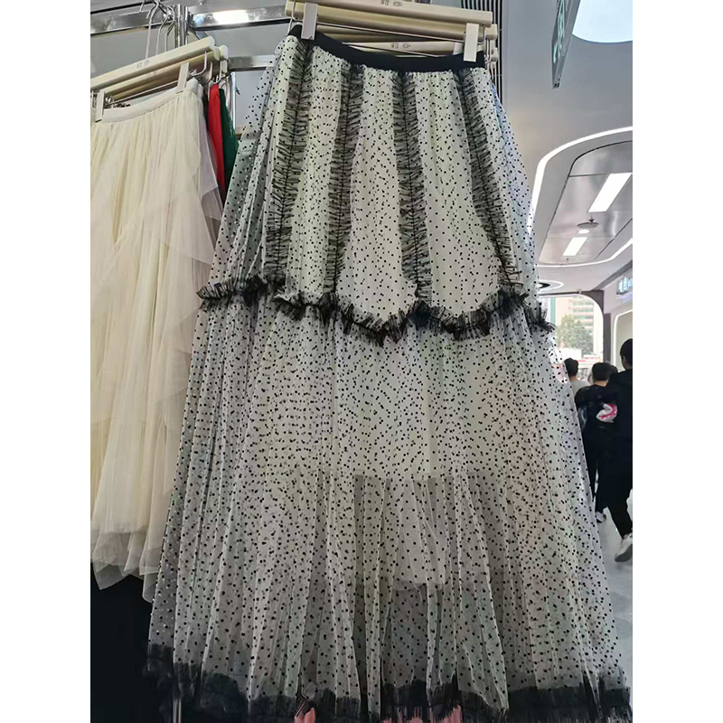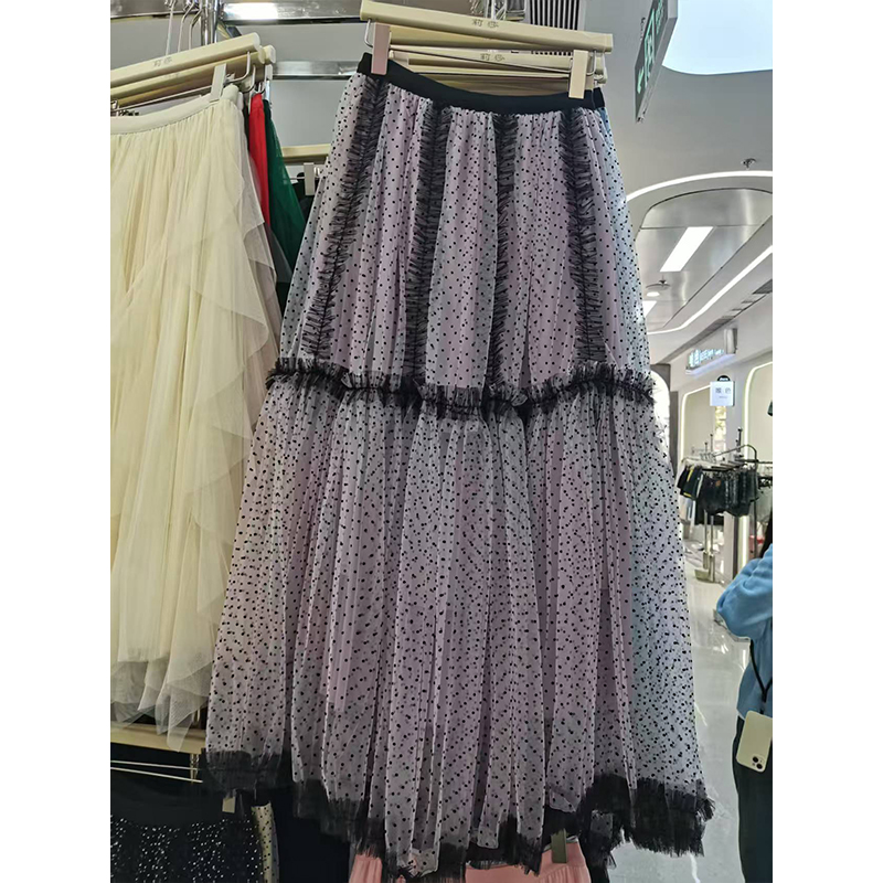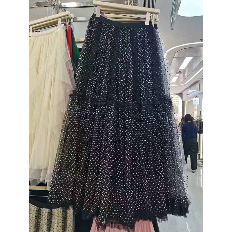 重工网纱半身裙秋冬新款波点a字气质优雅高级感蓝色百褶蛋糕长裙