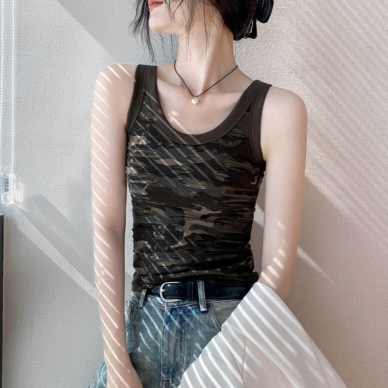 圆领美式辣妹迷彩拼色背心吊带女夏季外穿设计感显瘦无袖上衣