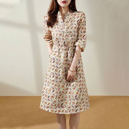 亚麻碎花连衣裙气质通勤女装2025夏款新款法式短袖中长款衬衫裙子