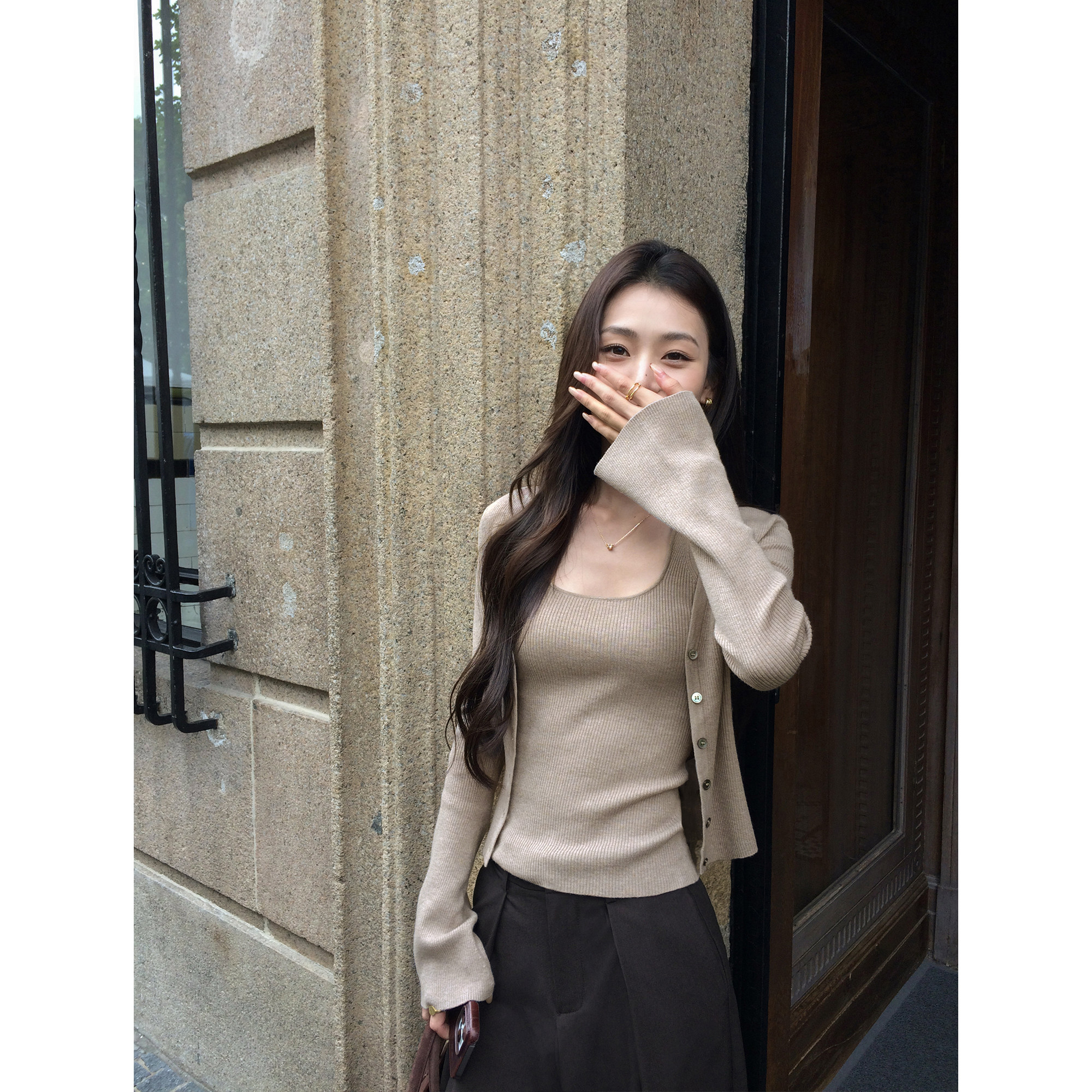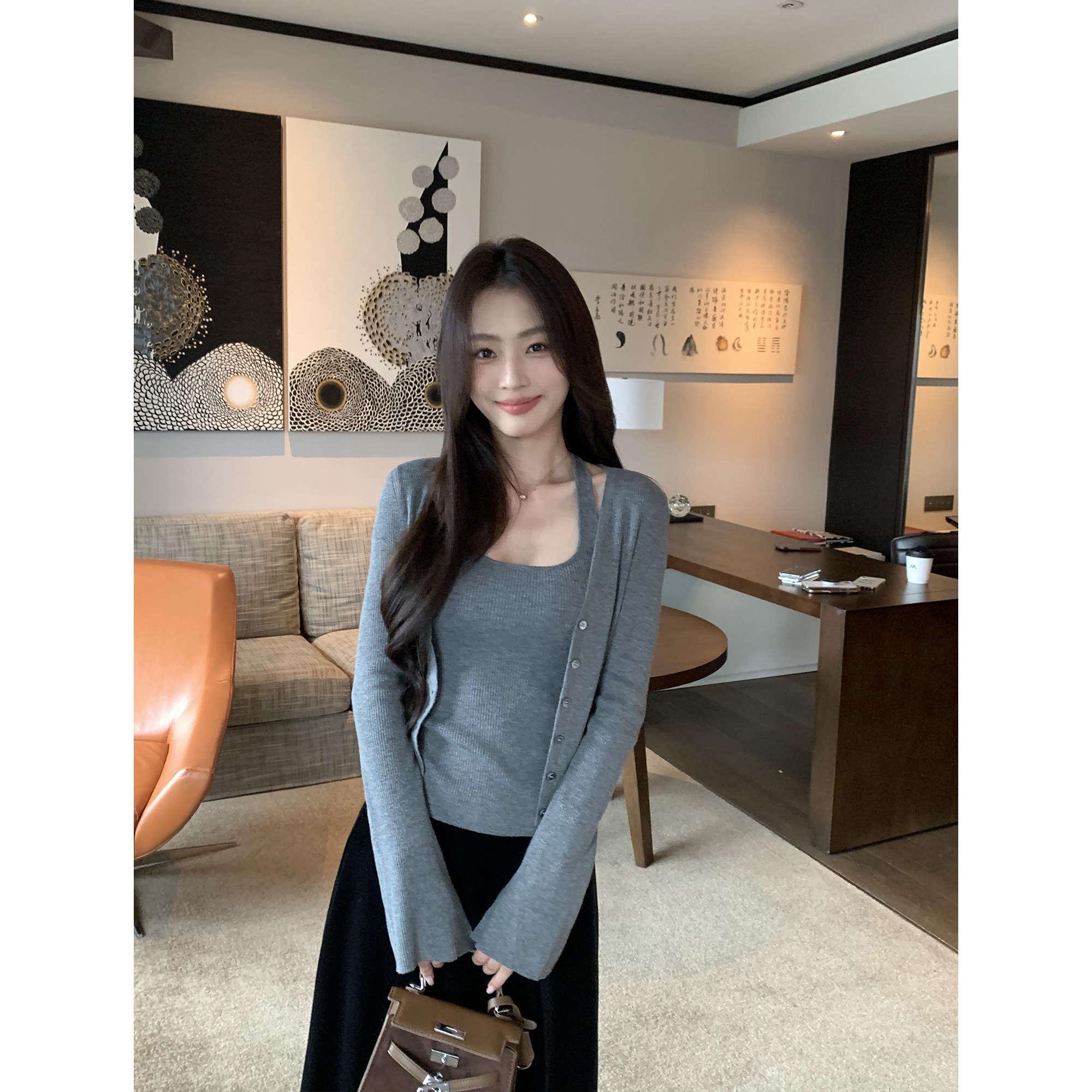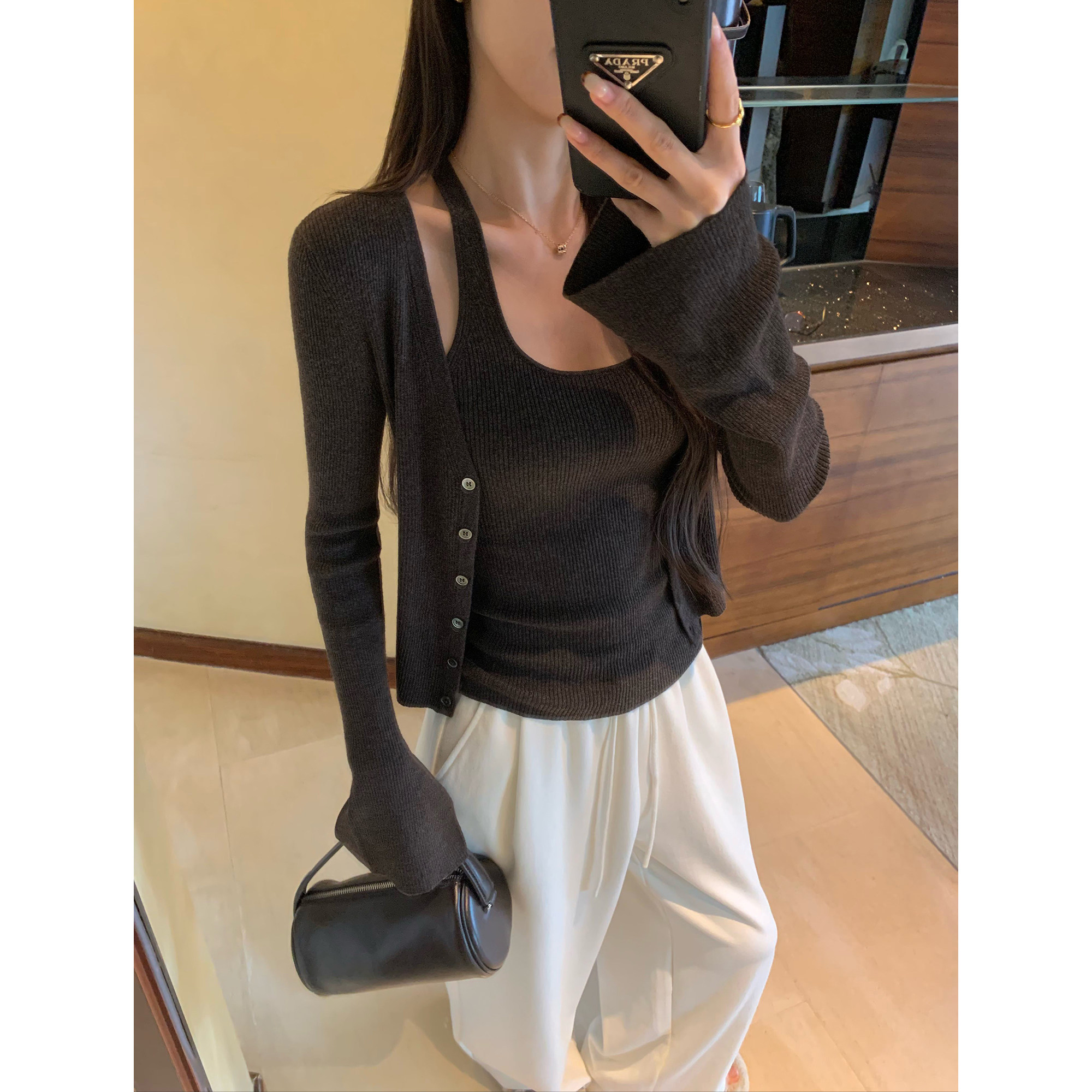 pusumede 心动邂逅 喇叭袖v领针织开衫女短款气质吊带背心两件套