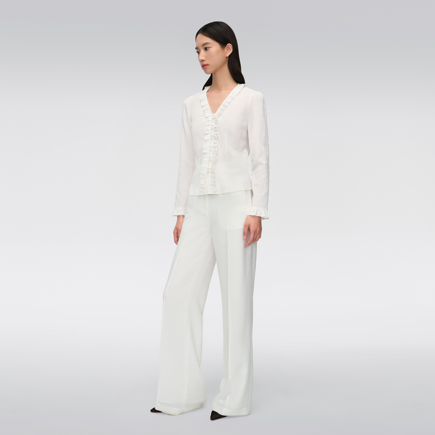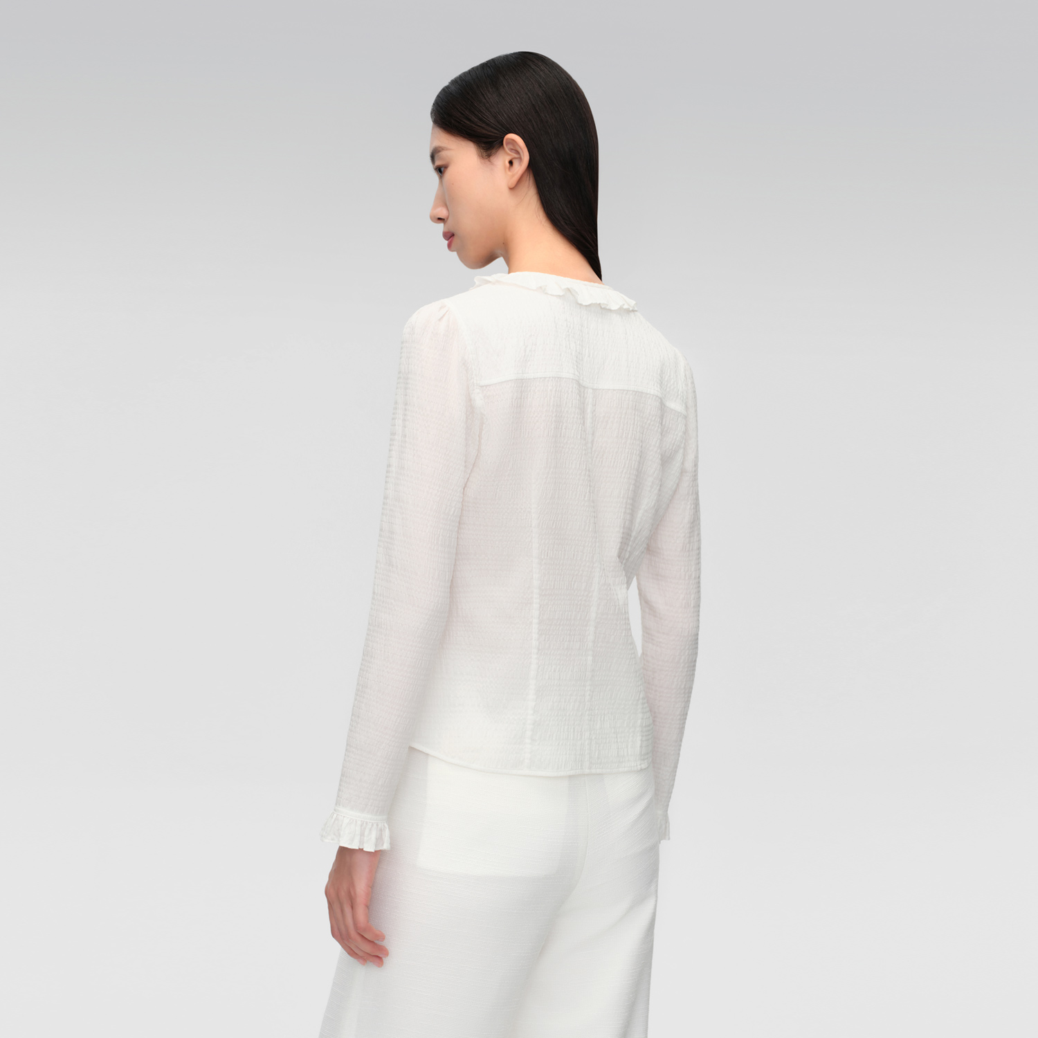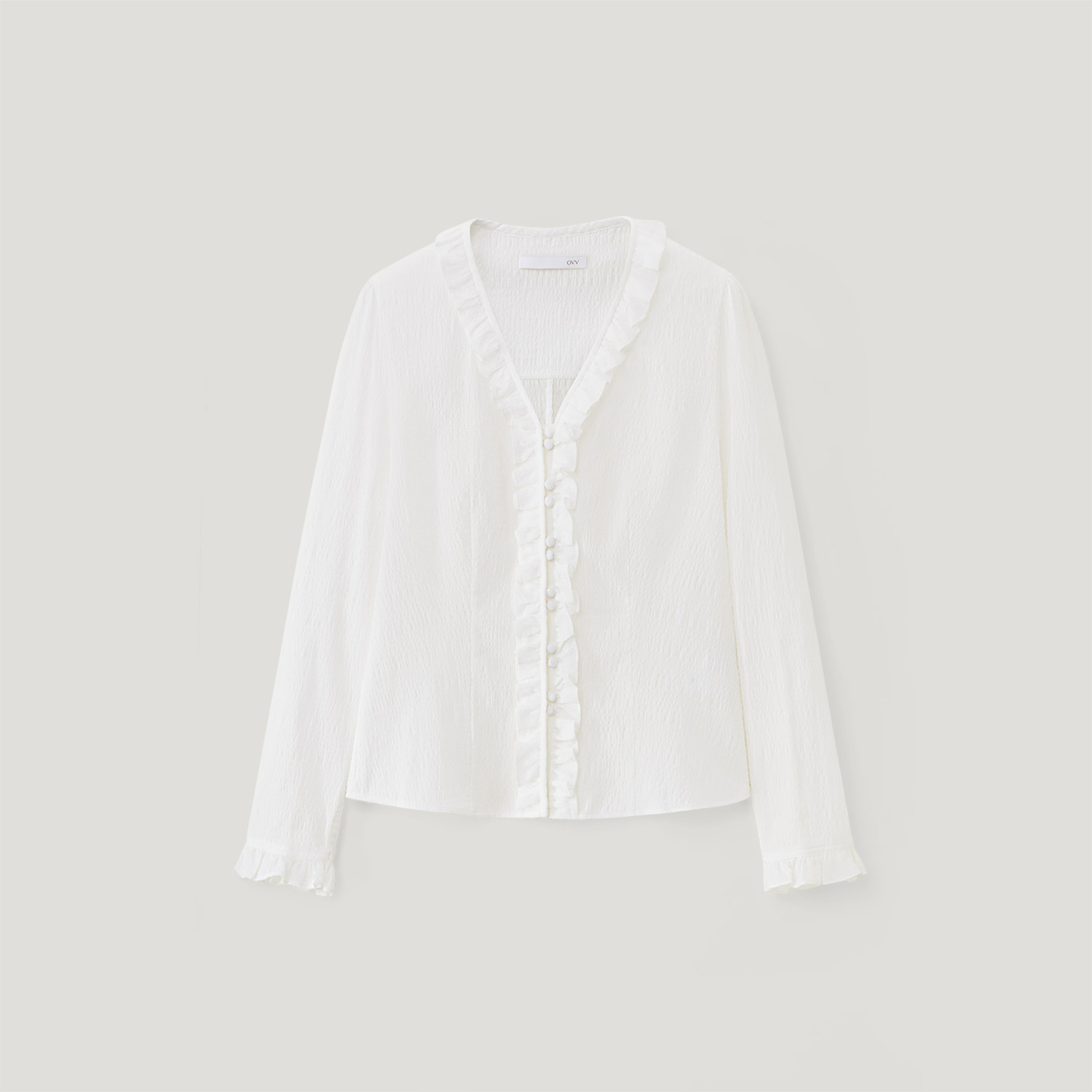 OVV春夏热卖女装弹力丝棉混纺花边V领泡泡肌理长袖衬衫