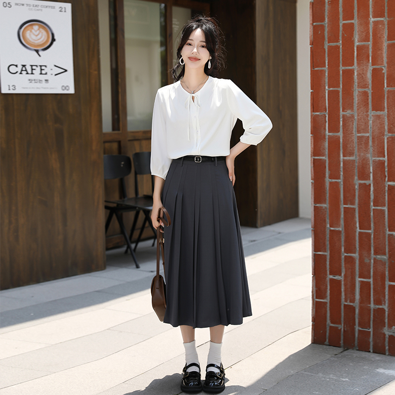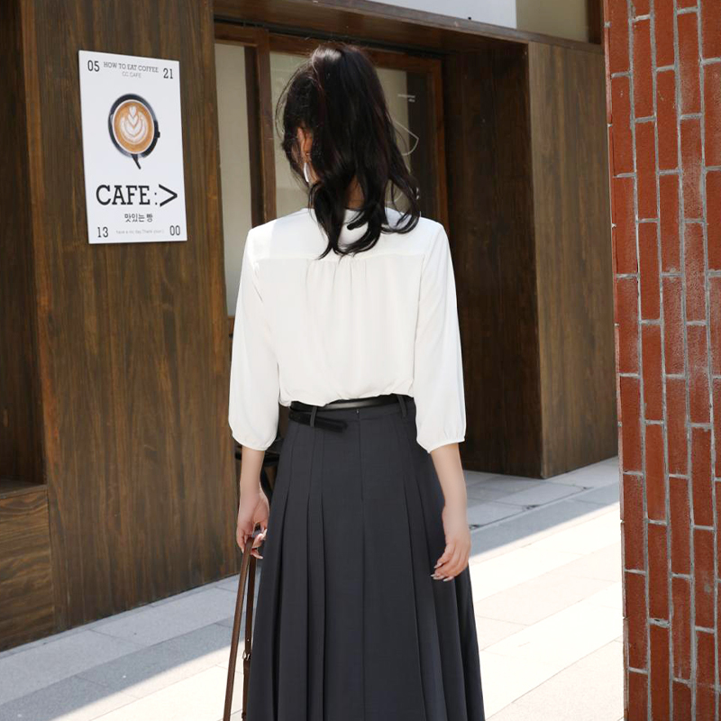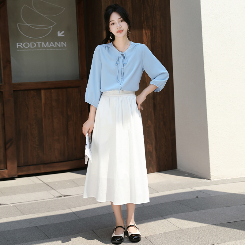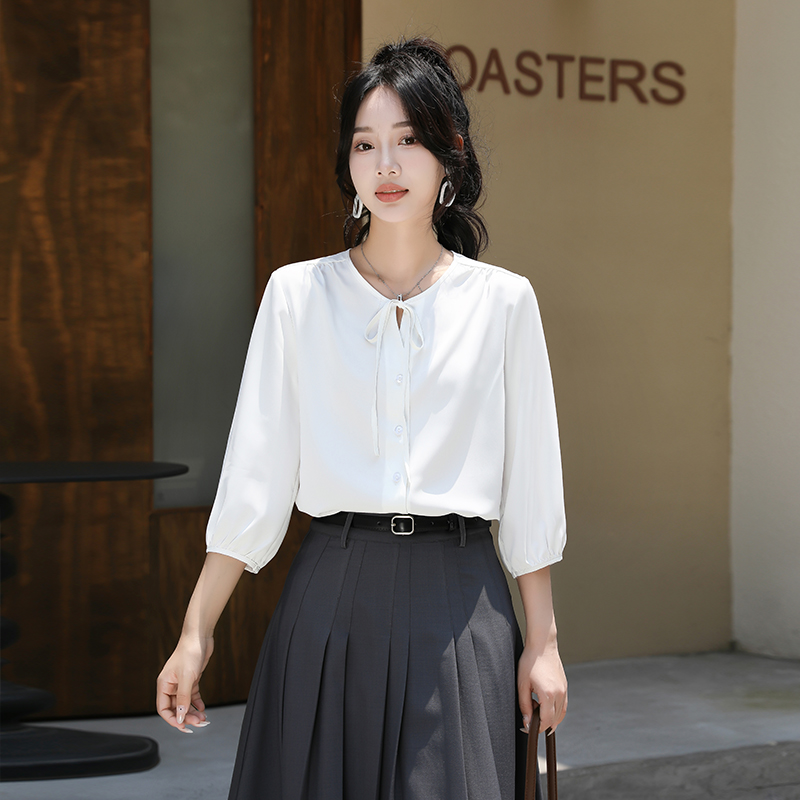 小个子雪纺七分袖蝴蝶结系带衬衫
