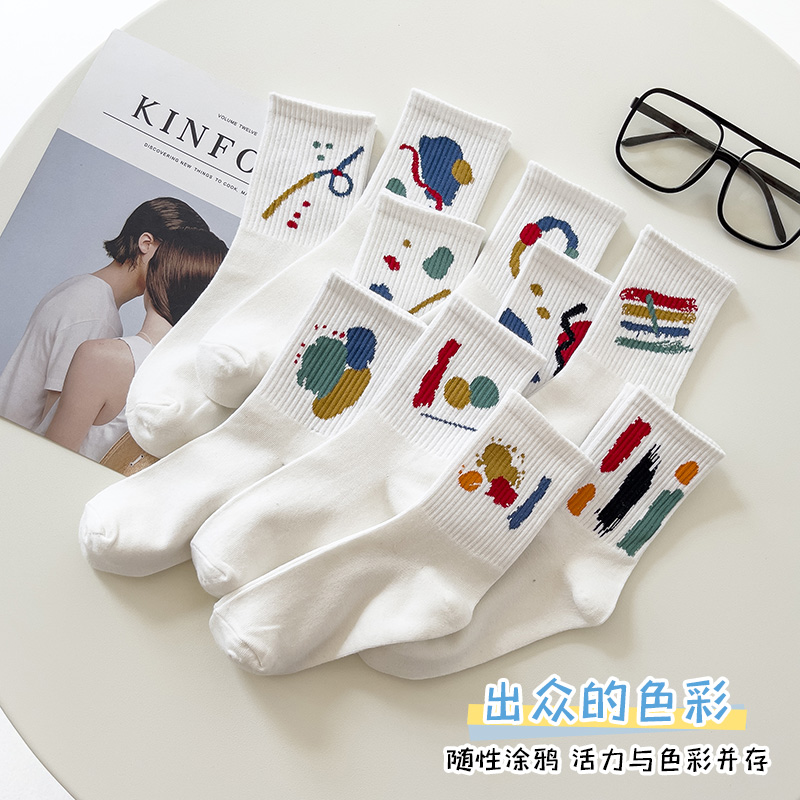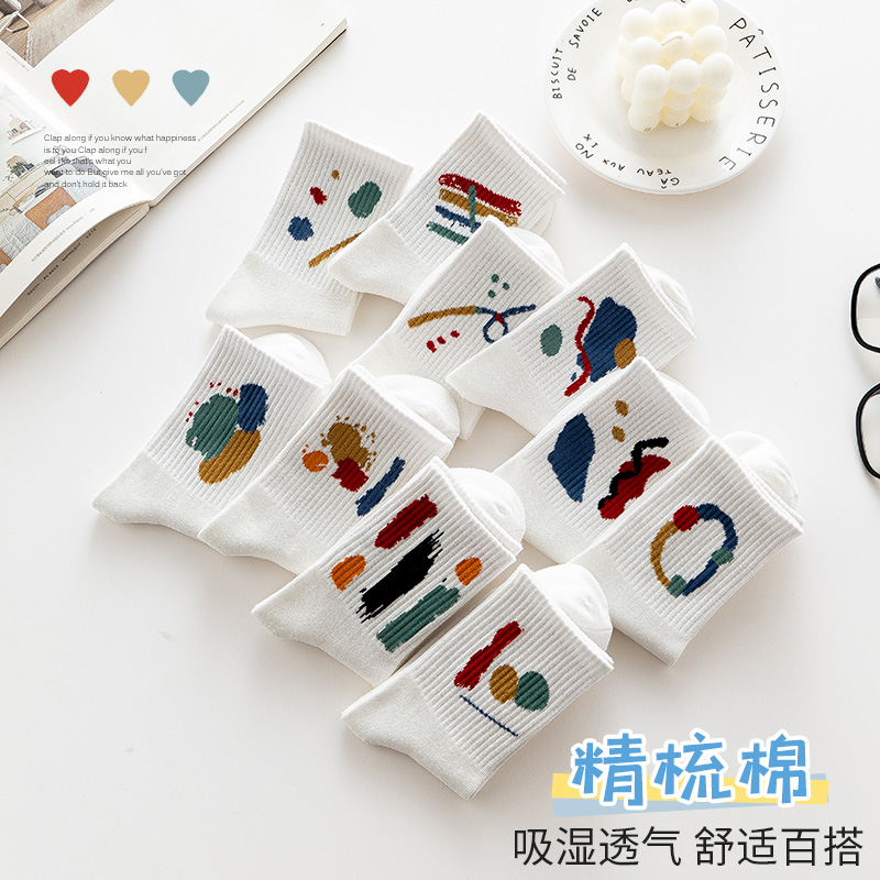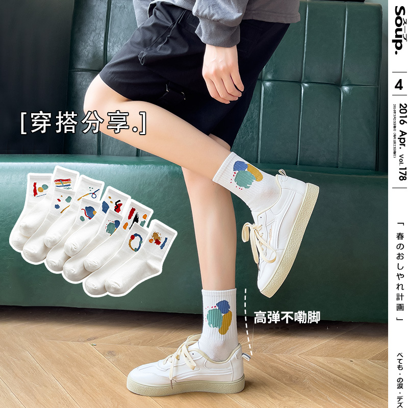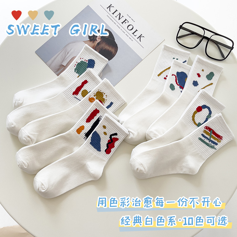 袜子女春秋中筒袜纯棉底日系卡通可爱白色运动透气ins潮长袜秋冬